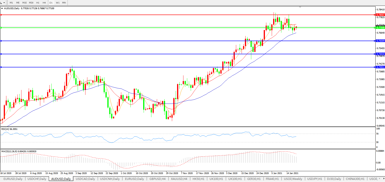 交易策略:0.7700下方看跌,目标0.7600、0.7500