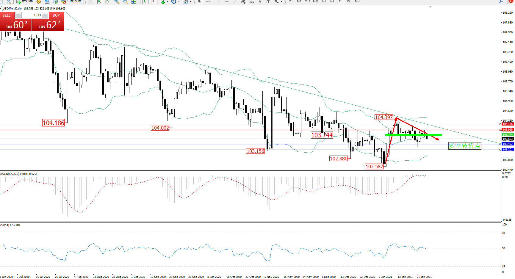 技术点评:低位多头动力强势反转上扬至104.397附近节点后遇阻,开始弱势整理至布林带指标中轨附近节点后弱势震荡,布林带指标呈缓慢张口走势后持续平移中,空头动力有继续弱势徘徊下移迹象,关注中轨附近节点,MACD指标处于0轴线附近持续徘徊中,RSI指标处于50均衡线附近窄幅整理中;