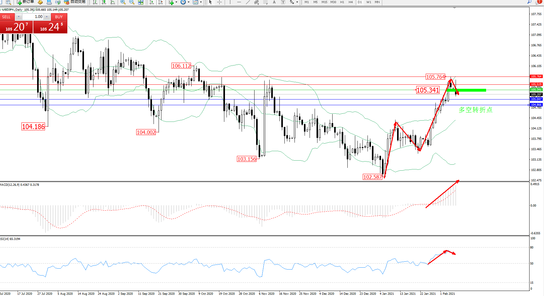技术点评:低位多头动力呈阶梯式震荡上行,延续布林带指标上轨附近节点持续拉升至105.764位置节点后反转下行,空头动力伺机入场向下移动,布林带指标呈张口走势后开始缓慢收口迹象,关注高位关键节点,MACD指标处于多头区域拉升后高位维持整理中,RSI指标处于多头区域高位震荡有反转下移迹象;