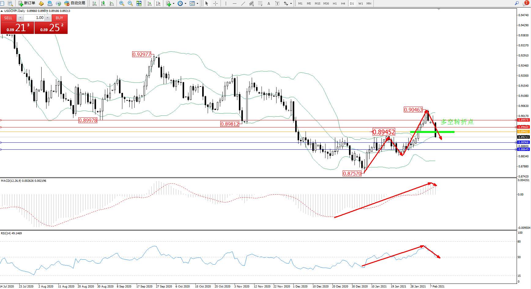 技术点评:多头动力维持在布林带指标通道中上轨区间持续震荡上扬,高位抵达0.90463位置节点后遇阻急速回撤下行,触及布林带指标中轨附近节点后有继续下行态势,布林带指标呈张口走势后有收口迹象,关注中轨上轨附近关键节点,MACD指标处于多头区域维持震荡平移中,RSI指标处于多头区域高位震荡后缓慢回撤至50均衡线附近徘徊中;