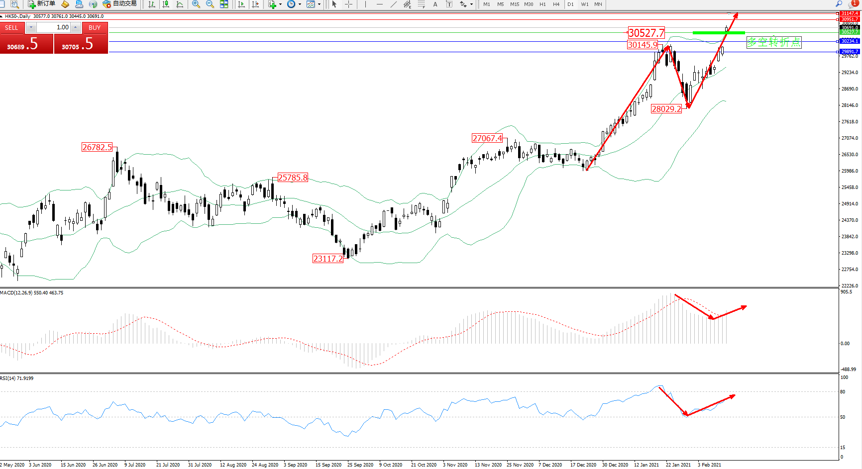 香港恒生指数2月16日(周二)收盘上涨573.09点,涨幅1.90%,报30746.66点;恒指暴涨近600点,为2018年6月以来最高收盘价,恒生科技指数涨2.72%报10694点。港股牛年首个交易日市场迎来一片欢腾,主要指数全日维持高位震荡。港股影视股飙升,资源股、半导体板块紧随其后,前期强势个股延续涨势,港交所逼近历史高点,由于A股仍在春节假期,南下资金无法“南下”,港股核心资产熄火,腾讯、美团高开低走均收跌超1%。但是低价股炒作如火如荼,雨润食品暴涨超45%,国美零售飙涨34%,凤凰卫视也大幅收涨31%。据香港电台网站等多家港媒消息,香港特区政府将于初七(2月18日)起有条件放宽部分社交距离措施,包括放宽限聚令至4人一桌,此外,堂食时间延长至22:00,美容、健身中心等处所可重新开放。5类处所仍须维持停业,包括派对房间、夜总会或夜店、浴室、泳池、麻雀天九耍乐场所。