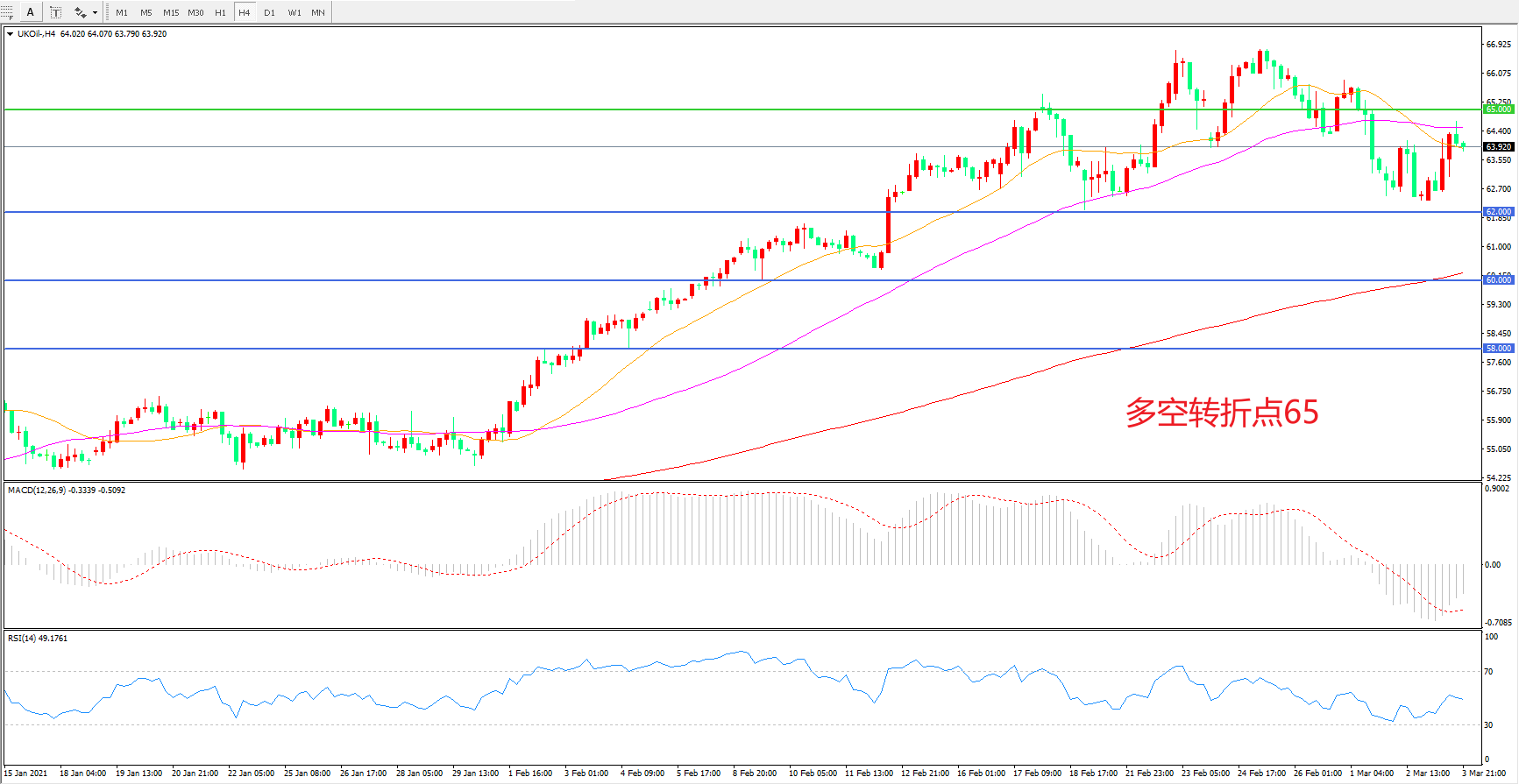 交易策略:  在65.00之下看跌,目标62.00    60.00