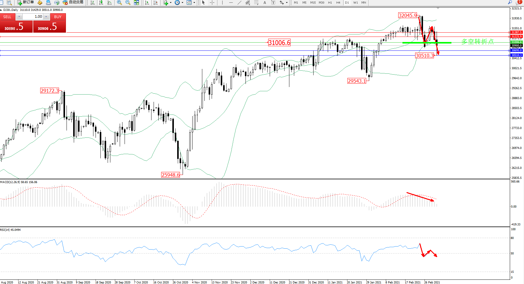 技术点评:高位空头动力持续窄幅震荡向下移动,跌破布林带指标下轨至30510位置节点后得到短暂支撑开始急速回升,但空头转势下行已然形成,有进一步向下移动态势,布林带指标呈收口平移走势后开始有张口迹象,MACD指标处于多头区域维持整理平缓下移中,即将触及0轴线附近节点,RSI指标纠结于50均衡线附近维持震荡后有进一步向下移动迹象;