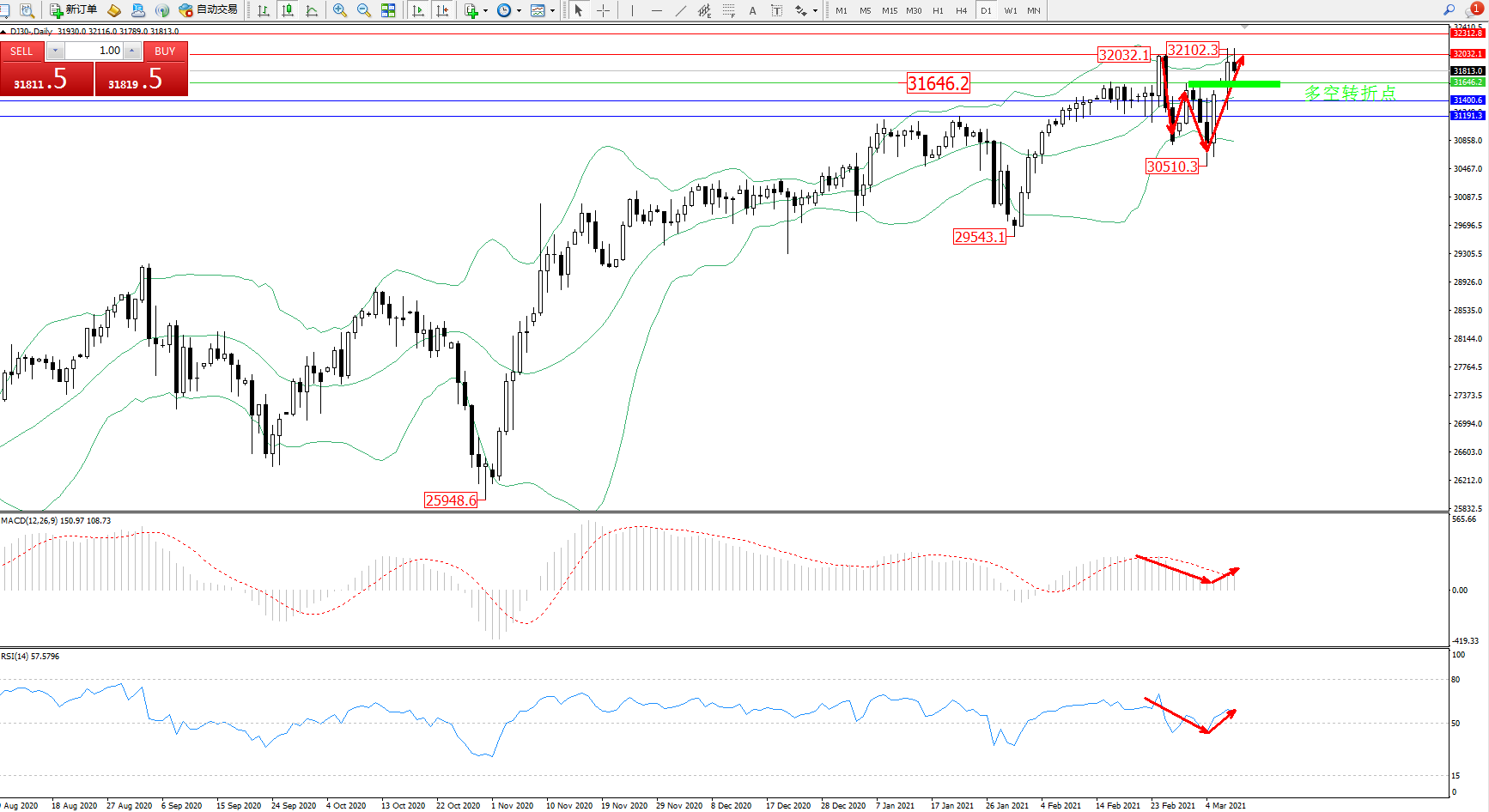技术点评:长时间维持在布林带指标通道内宽幅震荡走势中,期间多次来回试探上下轨区间节点,多空动力均处于焦灼状态,短暂突破前高32032位置后维持整理,多头动力或将继续向上移动,布林带指标呈缓慢张口走势中,MACD指标处于多头区域维持整理平移,RSI指标处于50均衡线上方维持震荡后有继续向上移动态势;