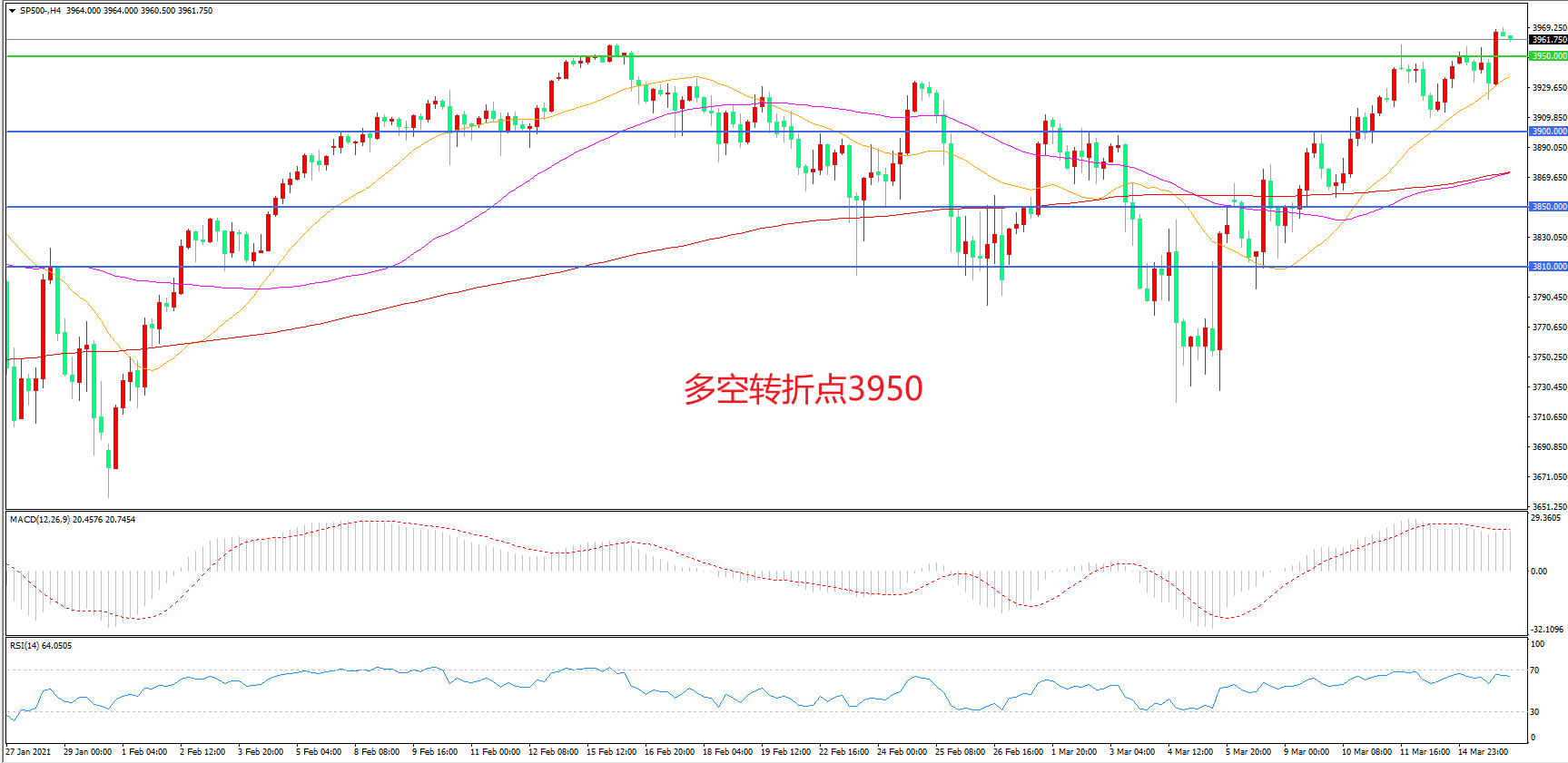 4小时图看,标普500长阳拉升,突破前期整理区间,短期走势表现偏强,21周期均线系统成为下方支撑,3950成为多空分水岭,MACD红柱增加,RSI指标走平,日内震荡上行概率较大。