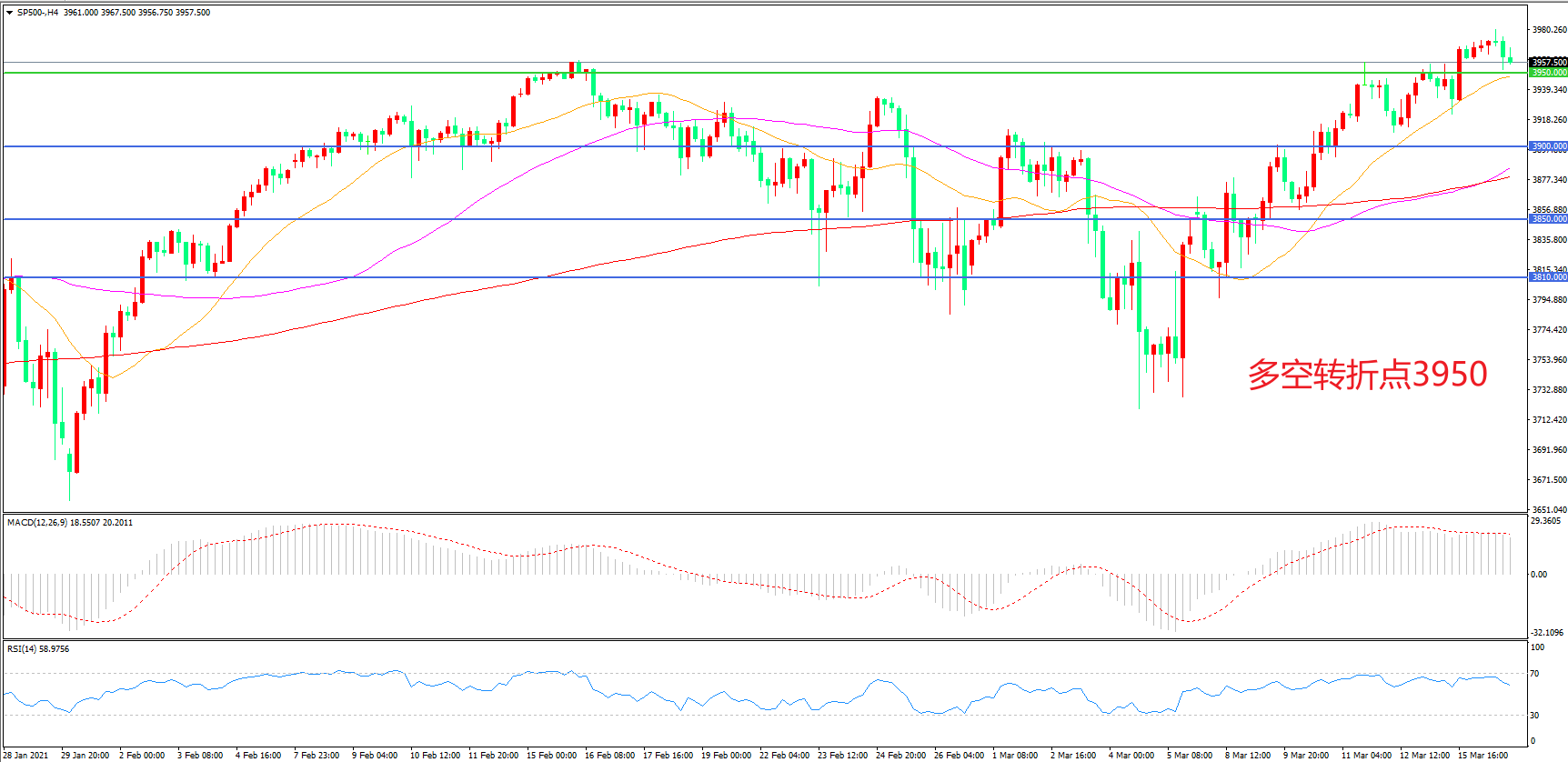 4小时图看,标普500突破前期整理区间后延续高位震荡,短期走势表现偏强,21周期均线系统成为下方支撑,3950成为多空分水岭,MACD红柱增加,RSI指标走平,日内震荡上行概率较大。