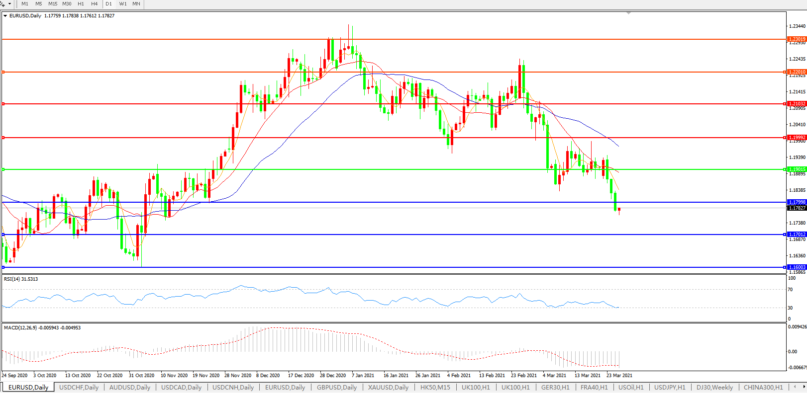 对欧洲延长封锁的担忧也令市场承压。欧洲领导人举行会议,讨论如何在新冠疫苗接种开局缓慢的情况下增加疫苗供应。欧元兑美元跌0.41%至1.1764,盘中一度跌至去年11月12日以来的最低水平1.1762;分析师预计欧元兑美元可能回落到1.16美元区间,因欧洲经济复苏落后于美国。美国银行的Paul Ciana周四在一份报告中称,欧元兑美元此前在1.23左右见顶,并且未能突破1.2555高点,意味着一个长期的三角形态正在构筑中,并有可能在2021年底的时候见到1.09。