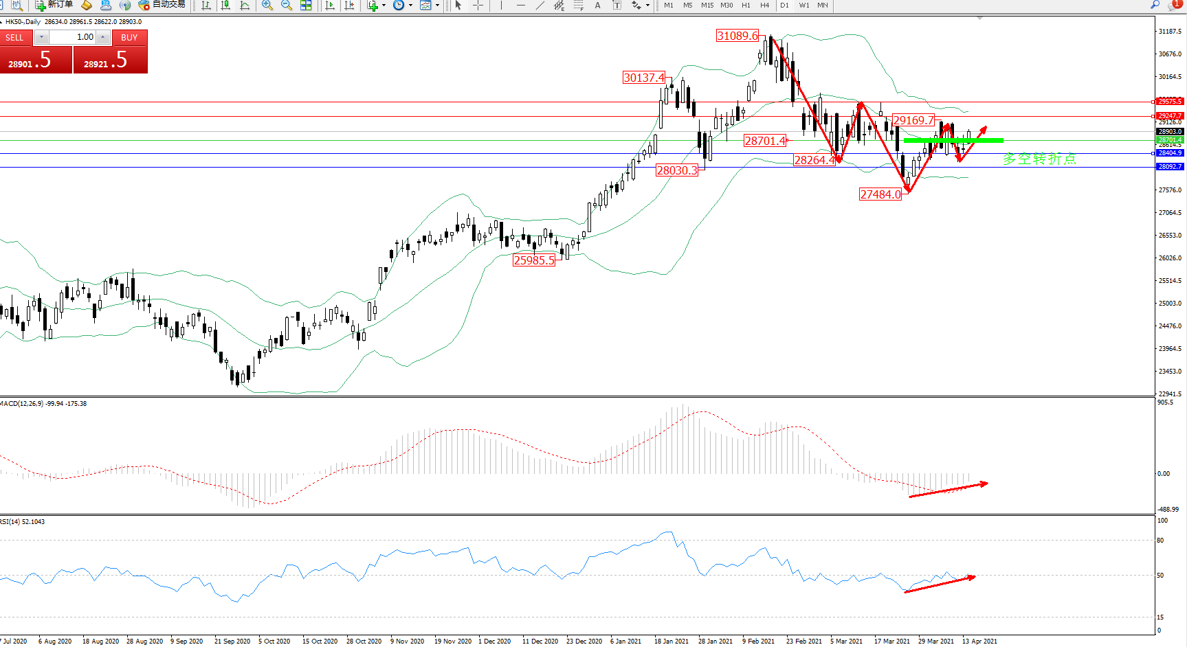 技术点评:空头动力延续布林带指标通道中下轨区间持续下行后,低位抵达27484附近得到支撑反转上移,纠结于布林带指标中轨附近持续震荡后有上移迹象,布林带指标呈收口走势后开始平移,关注中轨附近节点,MACD指标处于0轴线下方空头区域维持整理缓慢上移,RSI指标处于50均衡线附近弱势徘徊中;