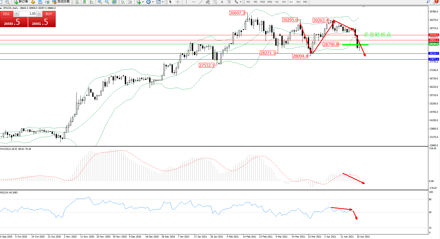 日经225指数4月21日(周三)收盘下跌607.38点,跌幅2.09%,报28493.00点。距离奥运会不足百天,而日本疫情还在反复。东京都知事考虑4月29日至5月9日期间进入紧急状态。但首相 菅义伟在记者会上表示:“我不认为紧急状态会影响奥运会。作为政府,将竭尽全力确保奥运会的安全。” 此前,大阪府已经要求中央政府宣布进入紧急状态以阻止疫情蔓延。小池百合子在会见自民党高层时表示,希望首都圈和大阪地区能同时宣布进入紧急状态,日本央行下周决策会议将微调部分经济预测,并维持宽松政策不变。所有44名接受调查的经济学家均认为,日本央行在4月27日结束为期两天的政策会议时料维持基准利率和资产购买不变。日本央行可能会在季度经济报告中将4月开始的财年增长预测从3.9%上调至4%。鉴于新冠疫情之下通胀持续低迷,日本央行在3月份公布了一系列政策措施调整,旨在让刺激措施能够施行更长时间。决策者们将在下周的政策会议上讨论经济前景。得益于强劲的海外需求,日本经济看来比预期更好地经受住了第二次紧急状态的考验。