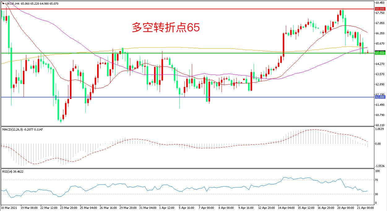 4小时图看,油价长阴破位,前期涨幅被吞噬殆,68美元成为上方阻力,65成为多空分水岭,MACD绿柱增加,RSI指标走平,日内震荡下行概率较大。
