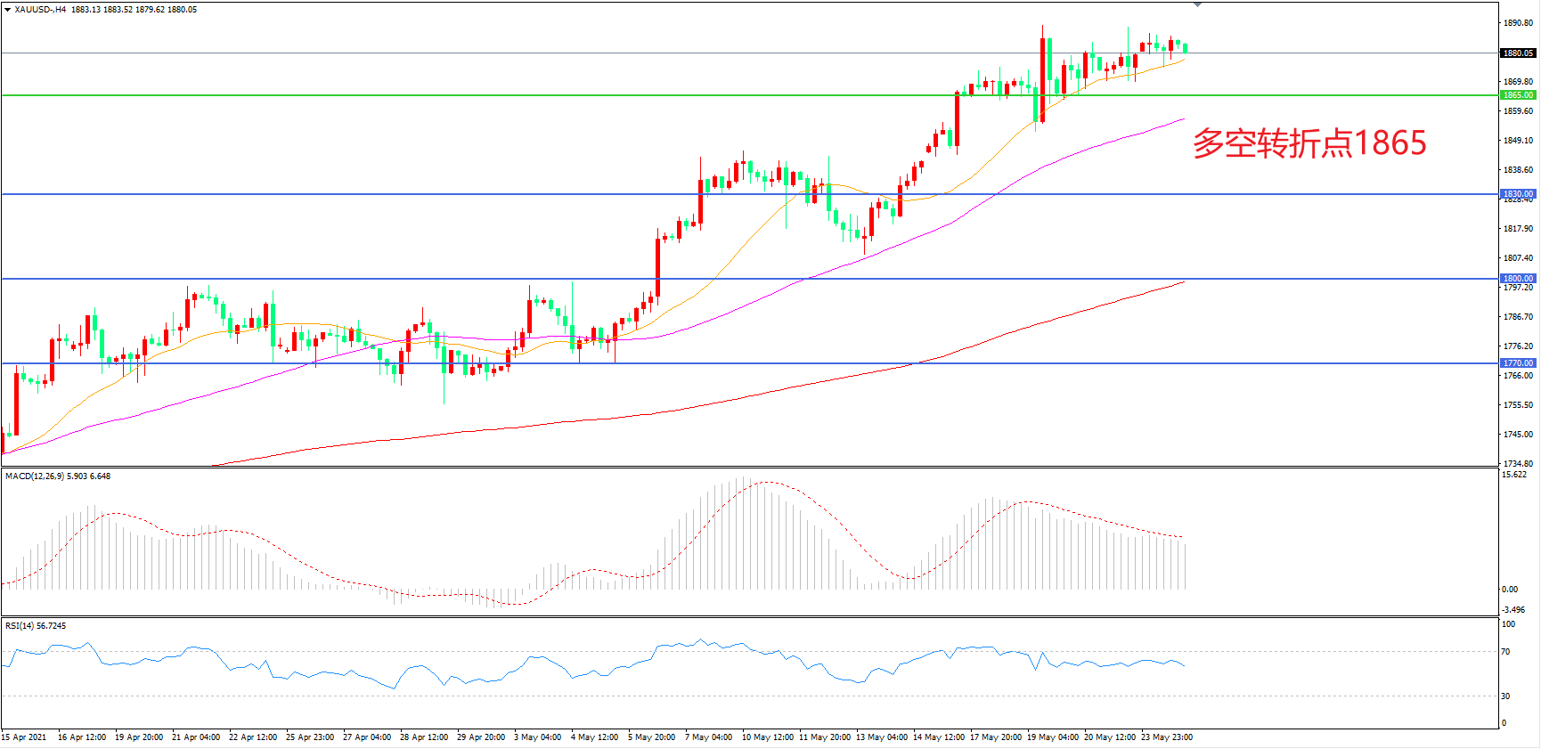 本周将有多名美联储官员发表讲话,周末还将发布美国4月个人消费支出(PCE)数据,尤其重要的是,美国国内生产总值(GDP)、初请领失业金人数以及耐用品指数,如果以上数据表现大大好于预期,可能会对黄金形成利空,如果数据逊于预期,金价可能会相当快地突破1900美元。