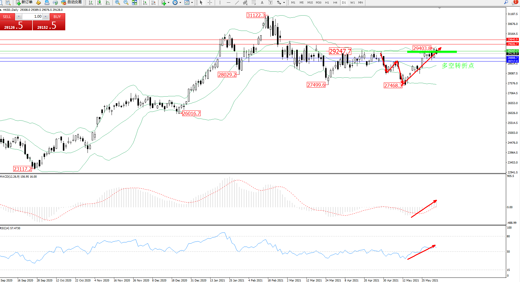 技术点评:空头动力震荡下行至27468位置后,低位多头动力震荡上扬,触及布林带指标上轨附近29403节点后开始短暂震荡,短期仍有破位上移迹象,布林带指标呈收口平移走势后开始有张口迹象,关注上轨附近震荡区间,MACD指标处于0轴线上方多头区域弱势震荡回升,RSI指标低位多头动力持续震荡上移至50均衡线附近后继续拉升上行中;