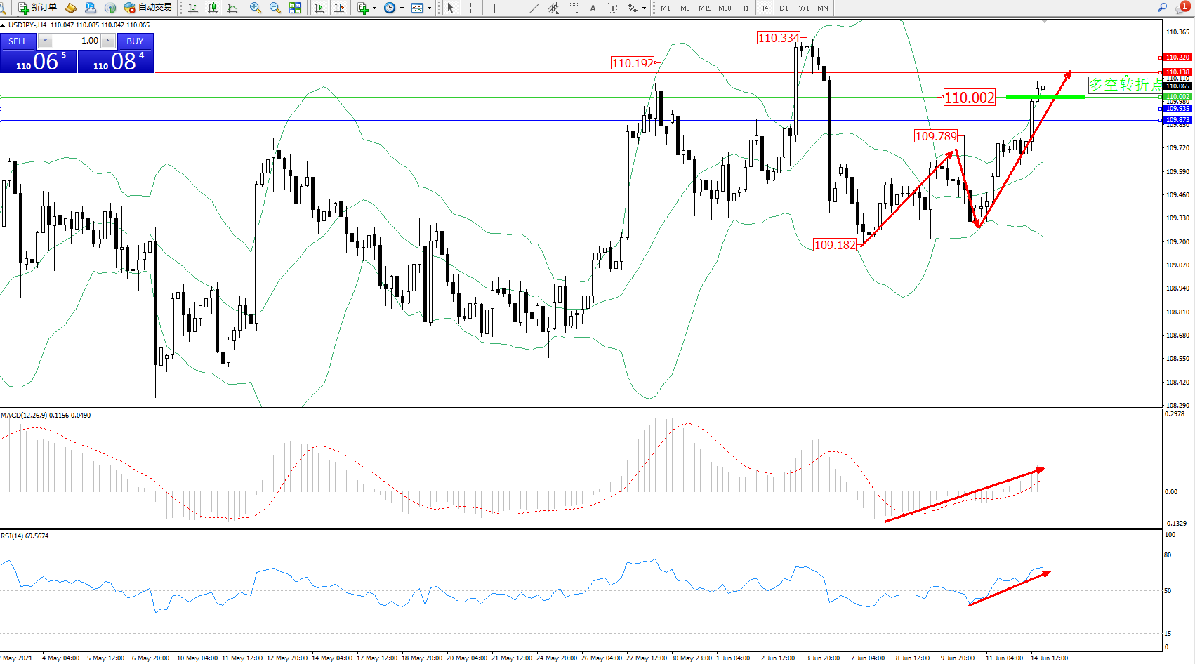 技术点评:长时间维持在布林带指标通道内低位窄幅震荡后,多头动力强势入场,延续布林带指标上轨附近节点不断拉升上扬中,且未见有止步迹象,前期高位110.334位置近在咫尺破位在即,布林带指标呈张口走势良好,MACD指标处于多头区域不断拉升上扬中,RSI指标处于多头区域持续向上移动中;