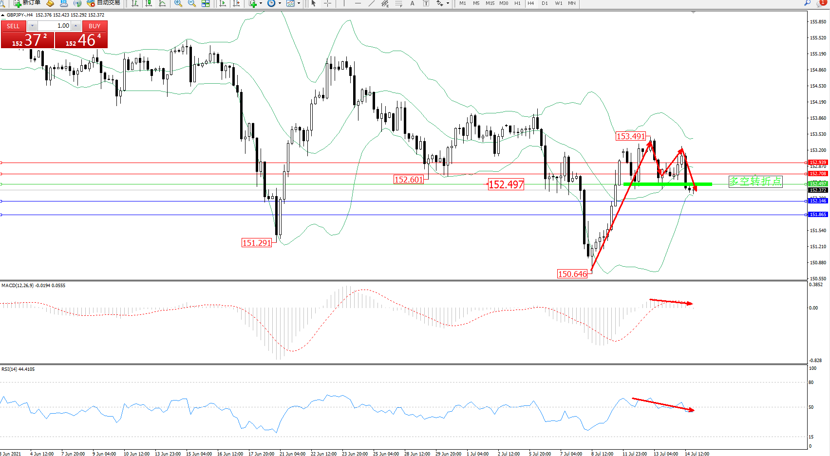 技术点评:多头动力强势拉升至布林带指标通道中上轨区间持续震荡上扬,高位抵达153.491位置节点后遇阻,开始震荡回撤,触及布林带指标下轨附近节点后开始有继续回撤下行迹象,布林带指标呈收口走势持续中,MACD指标处于0轴线上方维持整理徘徊,RSI指标处于50均衡线附近弱势整理后开始缓慢下行;