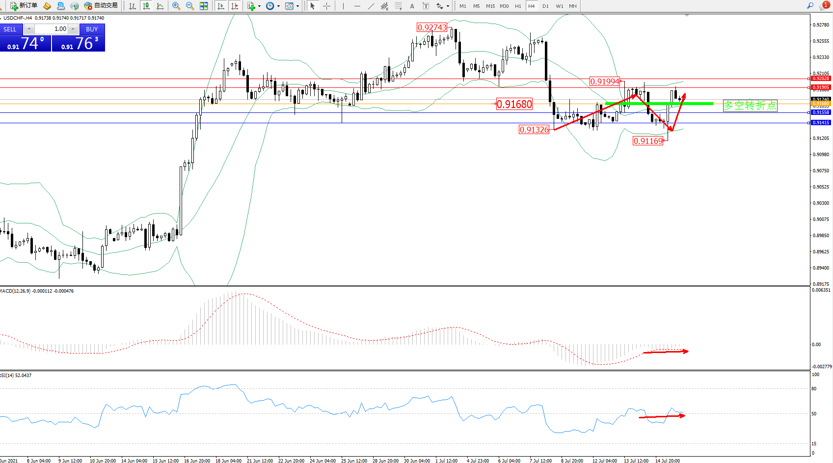 备选策略:0.91680下方看跌,目标0.91558、0.91415