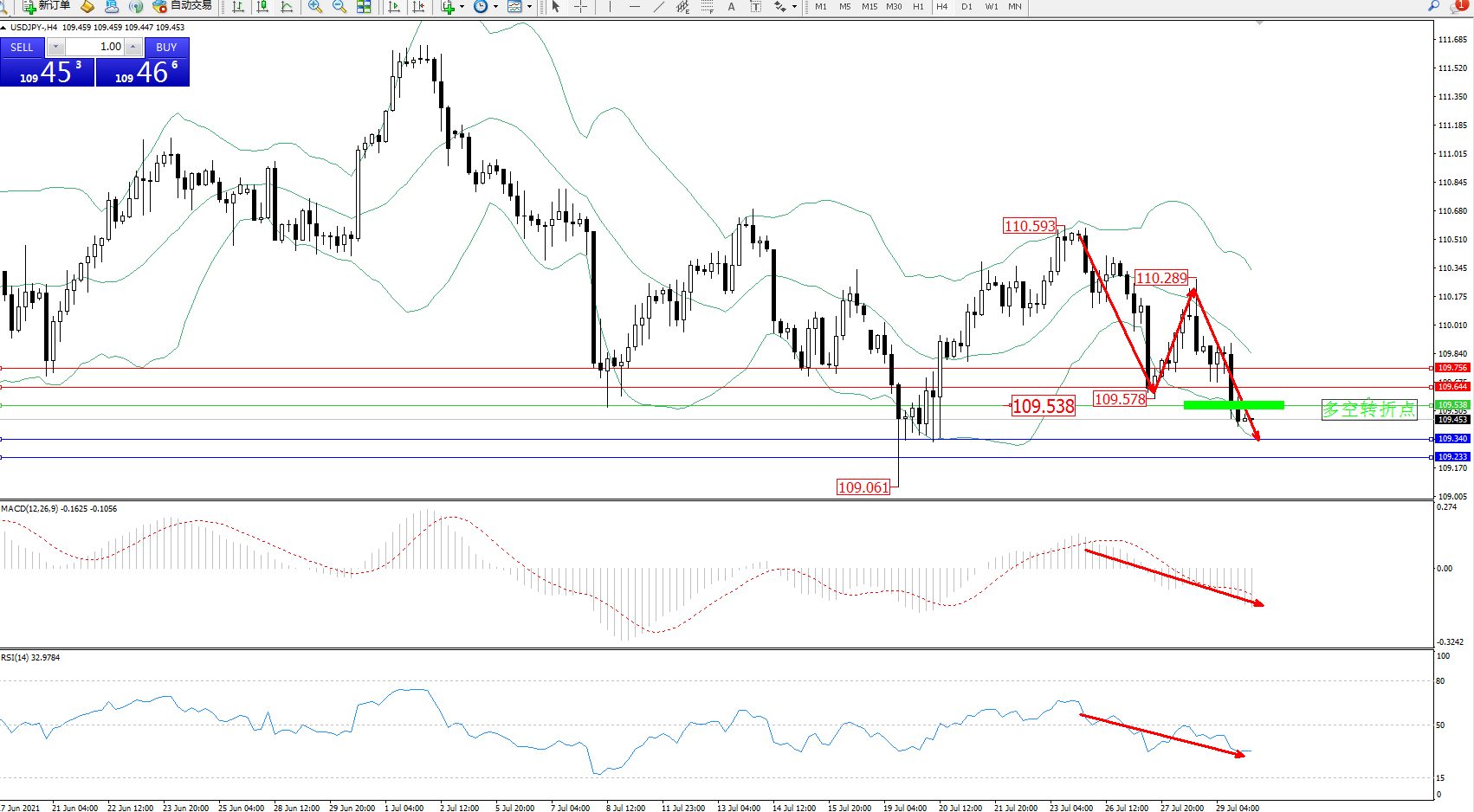 技术点评:空头动力延续布林带指标通道中下轨区间持续震荡向下移动中,跌势未见最终止步迹象,前期低位109.061位置近在咫尺,布林带指标呈向下移动态势良好,MACD指标处于0轴线下方空头区域维持整理下行,RSI指标处于50均衡线下方空头区域持续震荡;