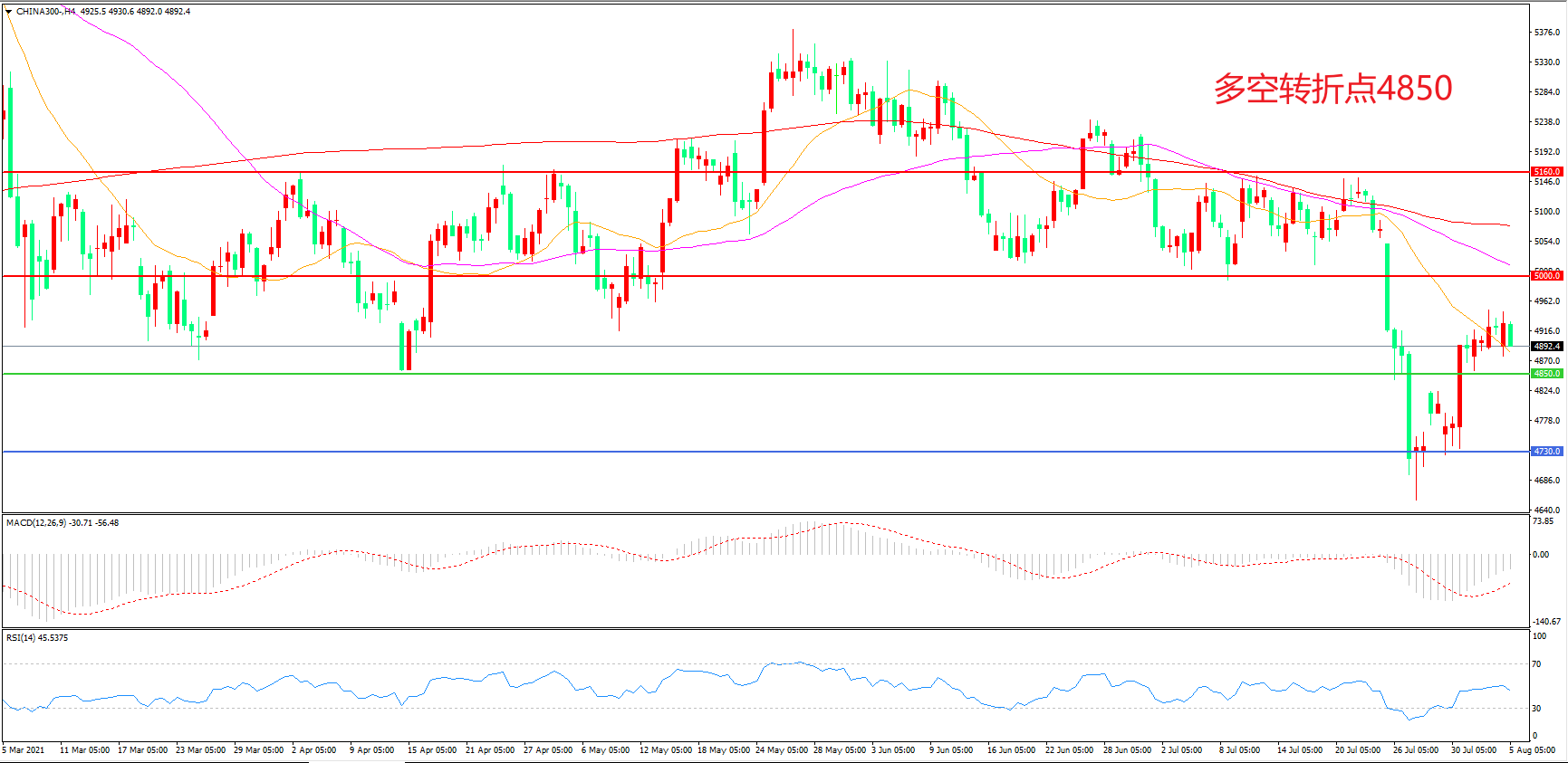4小时图看,沪深300以4850为依托延续区间震荡,短线行情有所回暖,5000点成为上方阻力,MACD绿柱减少,RSI指标走平,日内震荡上行概率较大。