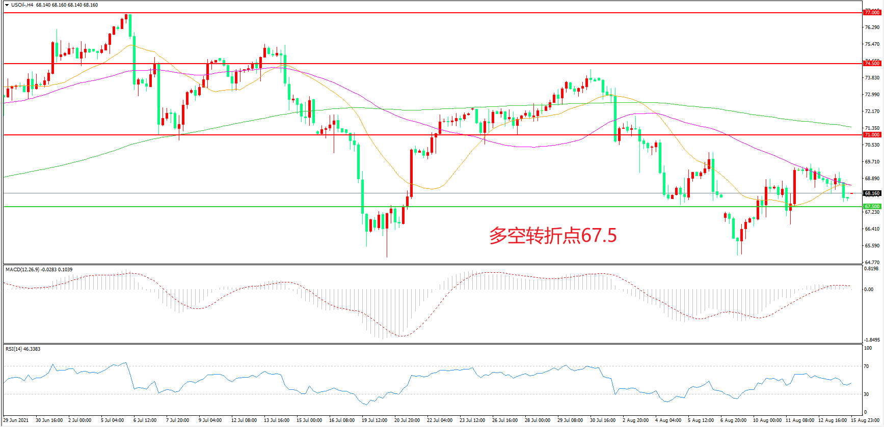 4小时图看,油价短线反弹后受制于55周期均线,67.5成为下多空分水岭,短线行情较为低迷,MACD红柱减少,RSI指标走平,油价震荡下概率较大。