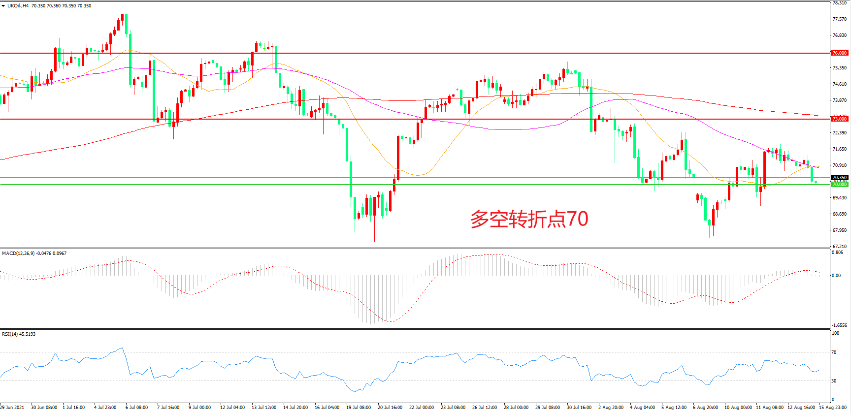 4小时图看,油价短线反弹后受制于55周期均线,70美元成为多空分水岭,短线行情较为低迷,MACD红柱减少,RSI指标走平,油价震荡下行概率较大。