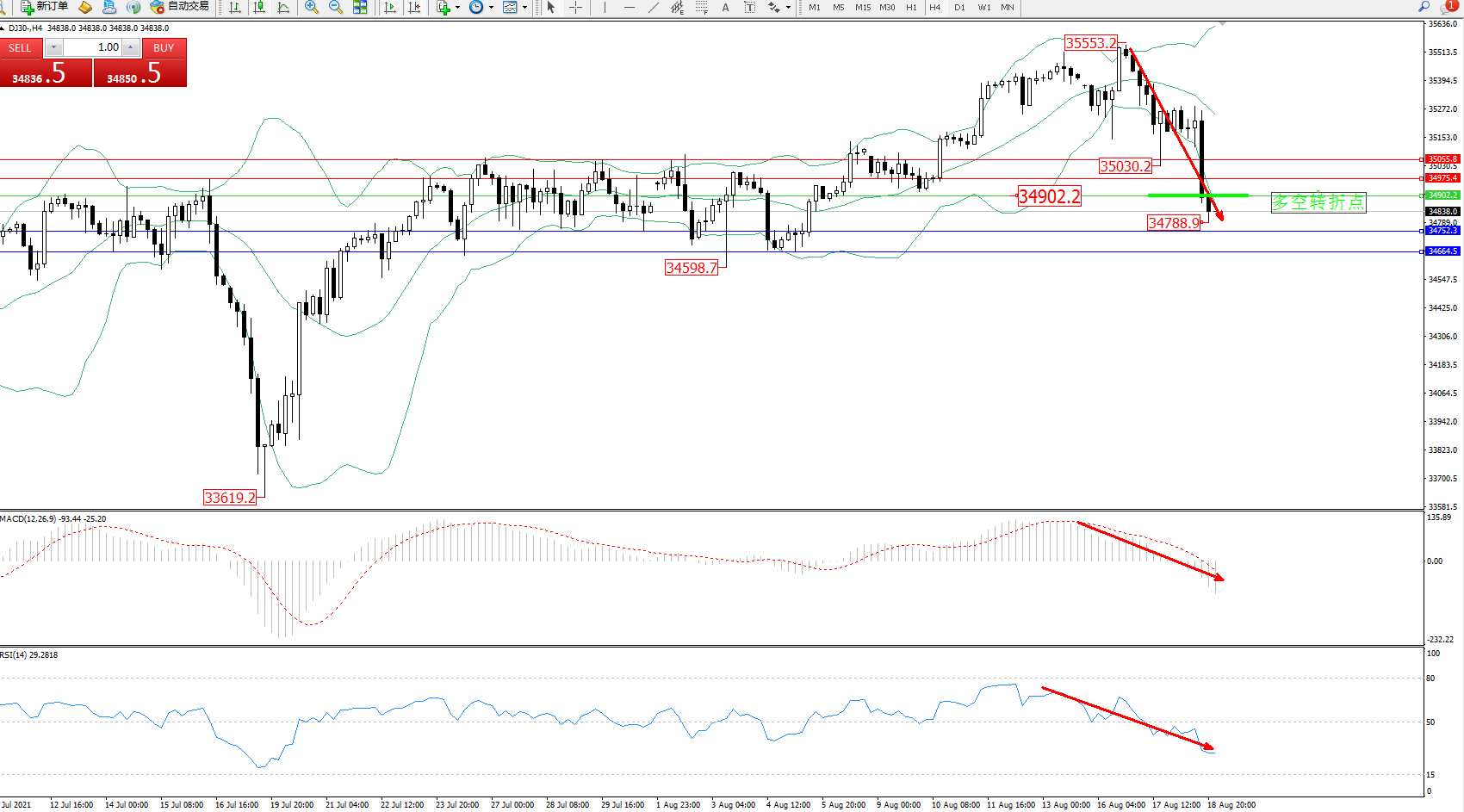 交易策略:34902下方看跌,目标34752、34664