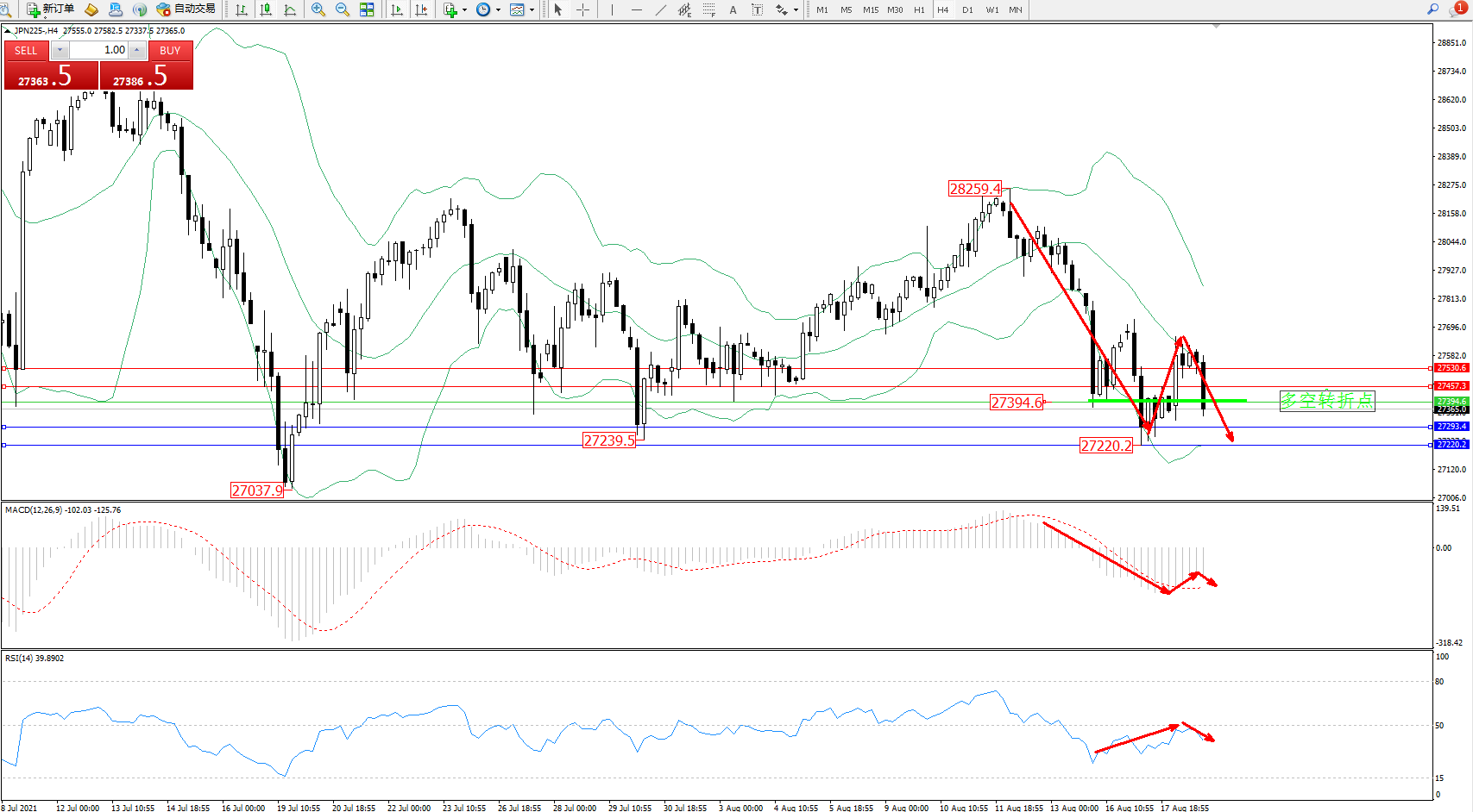 技术点评:空头动力延续布林带指标通道中下轨区间持续震荡下行,低位27220附近得到支撑后开始反转上移,触及中轨附近节点再度下挫,布林带指标呈收口走势中,MACD指标处于空头区域低位震荡中,RSI指标处于空头区域低位震荡缓慢上移后开始再度下行;