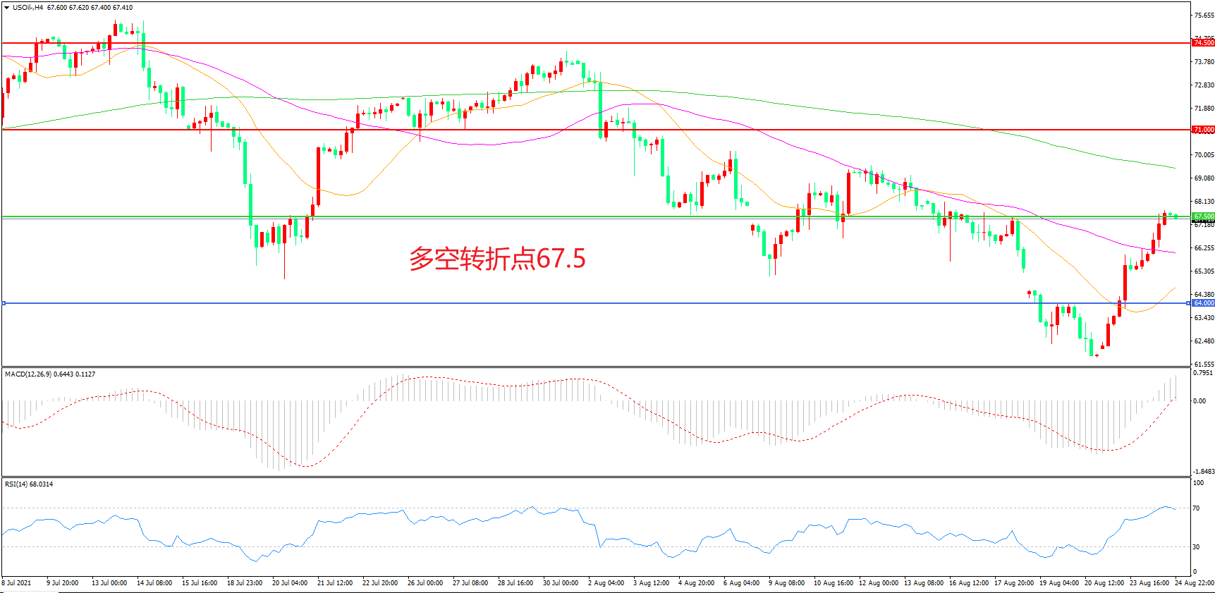 周二(8月24日),市场逐渐消化了前期美联储缩表的预期,开始逐渐关注本周的杰克逊霍尔央行年会,与此同时,持续恶化的疫情也对美联储预期退出QE的时间有了推后的可能,风险情绪推动美国WTI原油再度反弹,收报67.58美元/桶。