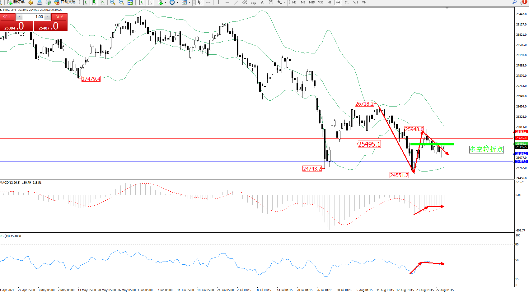 技术点评:空头动力延续布林带指标通道中下轨区间持续震荡下行,低位抵达24551位置后反转拉升,纠结于布林带指标中轨附近维持震荡向下移动,布林带指标呈收口走势持续中,短期或维持低位整理,MACD指标处于空头区域短期整理上移后开始平移,RSI指标处于50均衡线下方空头区域维持弱势徘徊;