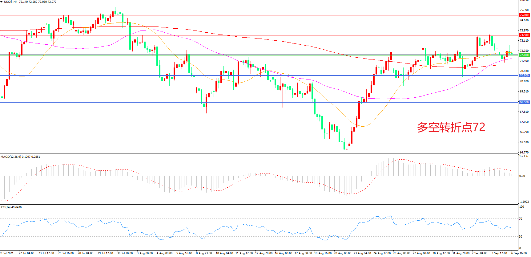 4小时图看,油价以55周期均线为依托窄幅震荡,72美元成为多空分水岭,MACD红柱缩短,RSI指标走平,日内震荡上行概率较大。