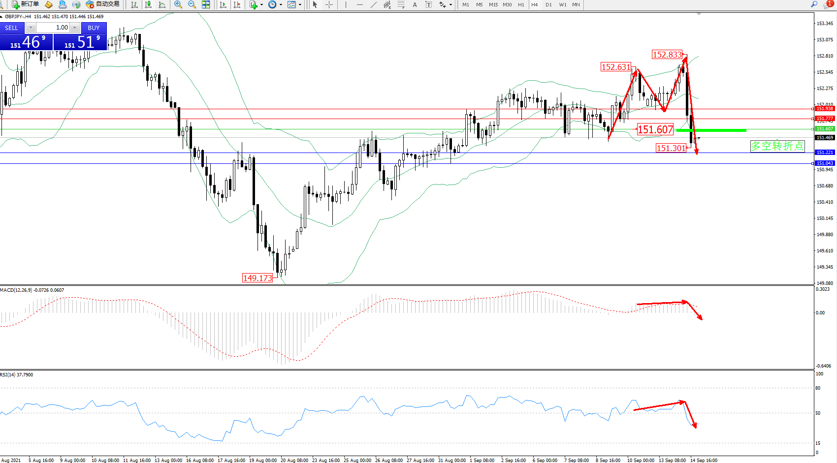 技术点评:长时间维持在布林带指标通道中上轨区间持续震荡,高位抵达152.833位置后遇阻回撤,急速下挫至下轨151.301位置节点开始短暂震荡,空头动力强劲,短期或维持低位整理,布林带指标呈张口走势持续中,MACD指标纠结于0轴线上方维持整理平移后震荡下挫至空头区域徘徊,RSI指标纠结于50均衡线上方震荡后空头动力急速下行至看头区域整理;