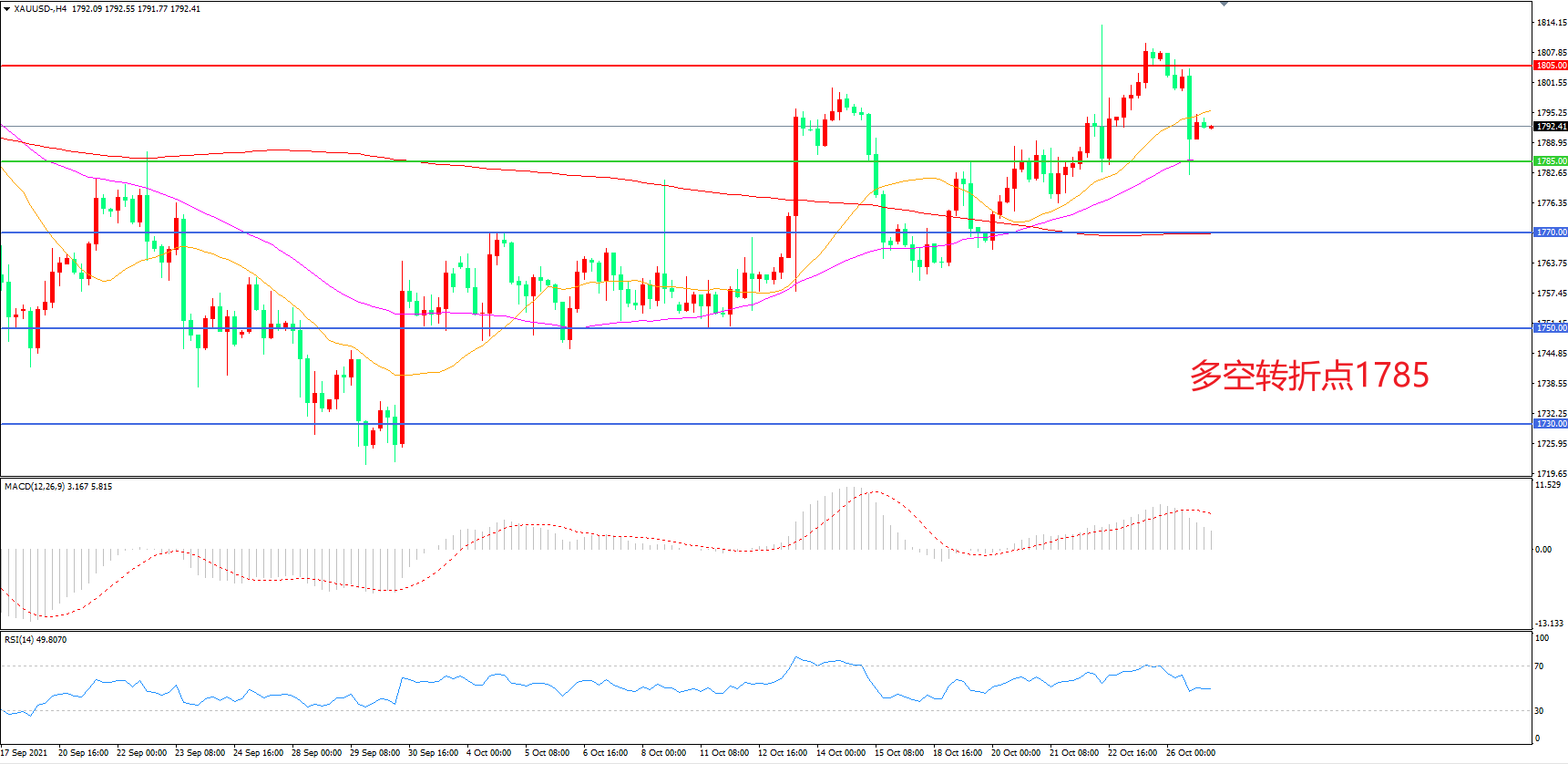 鉴于市场对通胀的关注,金价不太可能偏离1800关口太远。