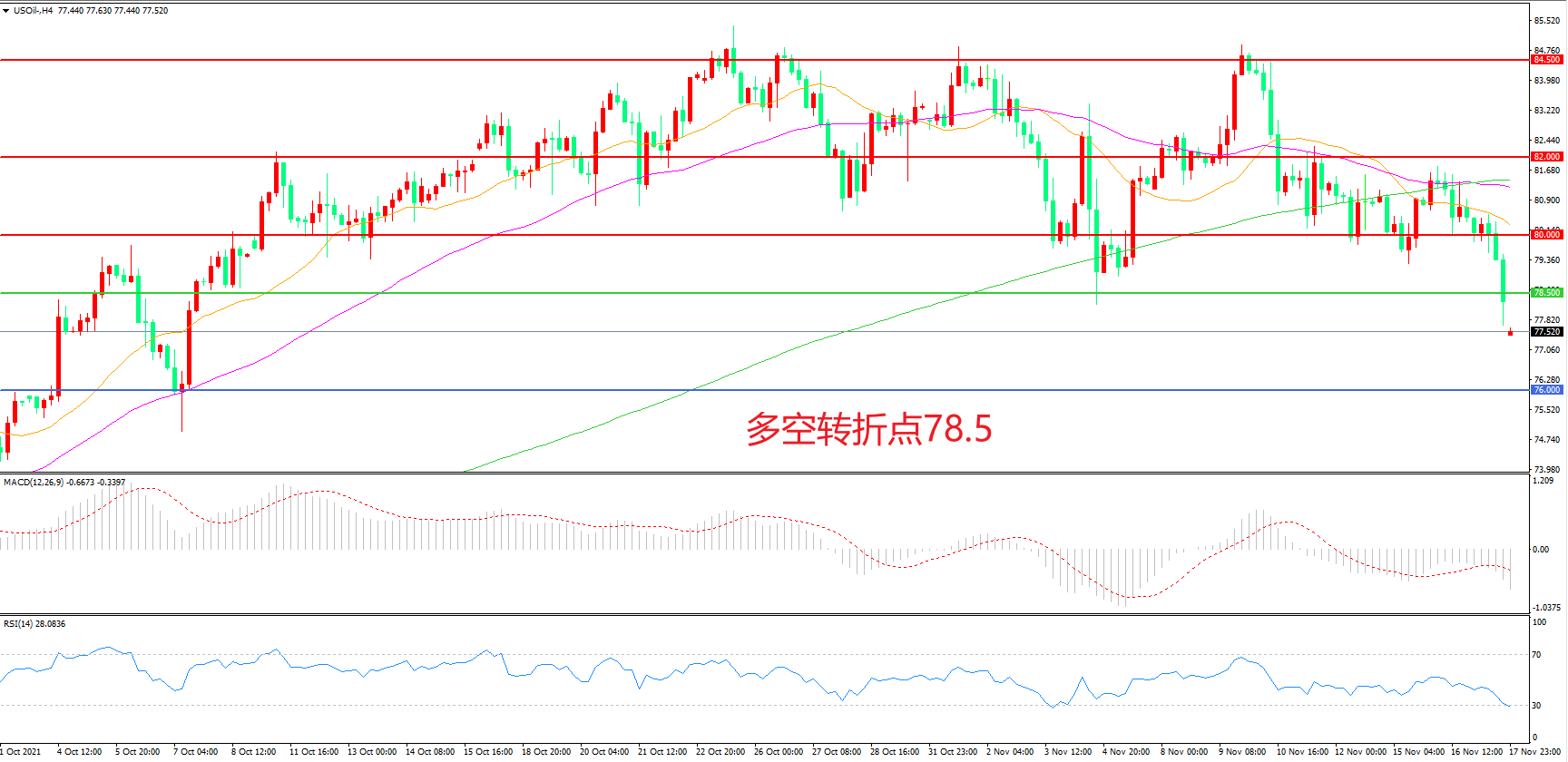 交易策略:在78.50之下看跌,目标76.00 74.00