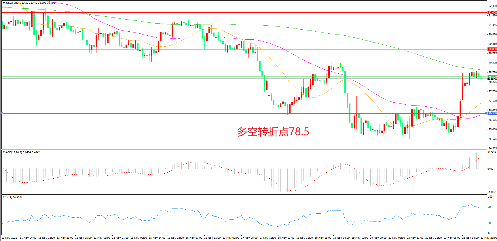 4小时图看,油价长阳拉升,整体表现有所回暖,200周期均线成为上方阻力,78.5成为多空分水岭,MACD红柱增加,RSI指标走平,日内震荡上行概率较大。