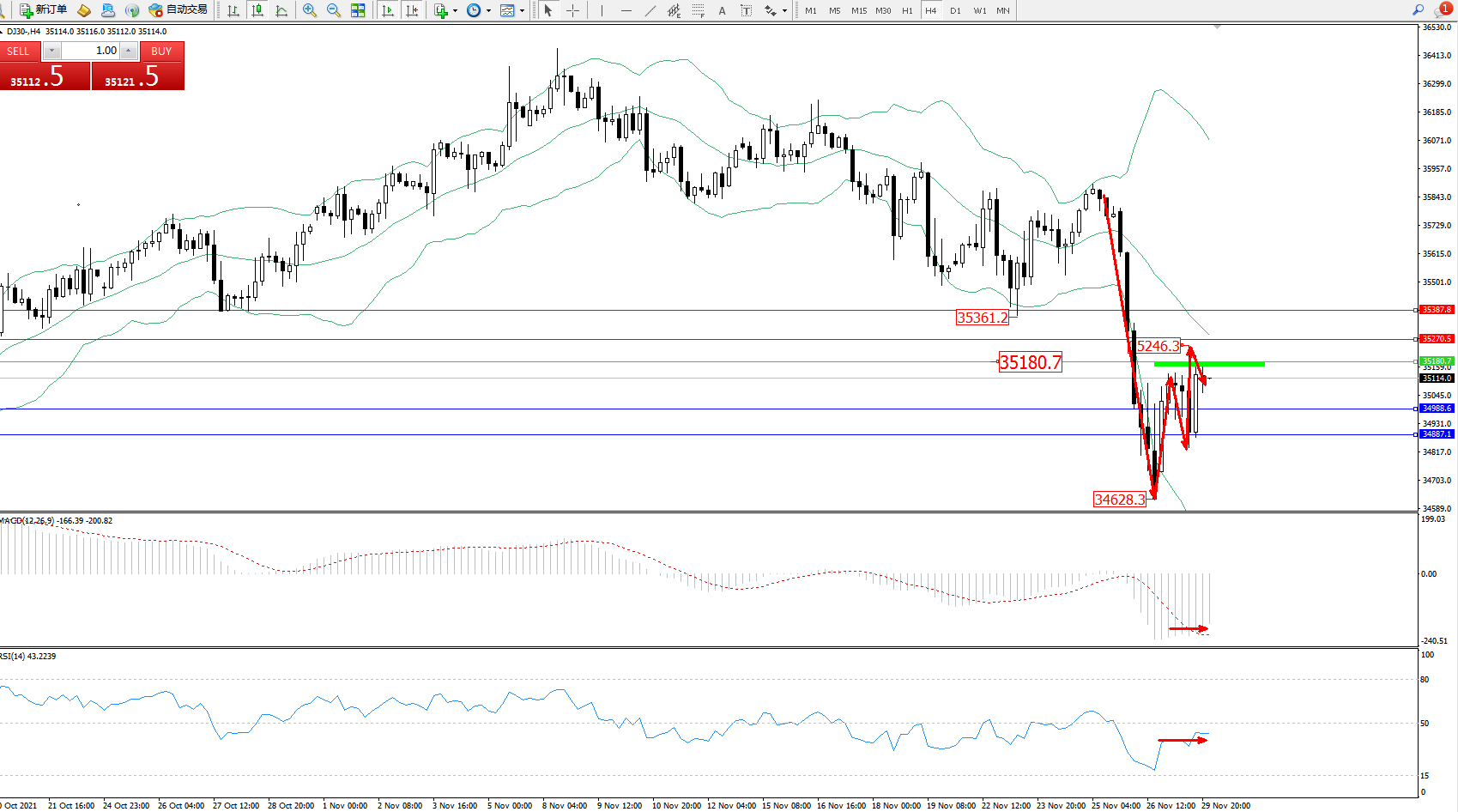 技术点评:空头动力延续布林带指标下轨附近持续震荡下行,低位抵达34628位置后开始反转震荡上扬,上方抵达35246位置遇阻开始震荡,短期空头动力有继续维持中下轨区间震荡态势,布林带指标呈张口走势后开始收口,MACD指标空头区域低位弱势整理上移,RSI指标纠结于50均衡线下侧弱势徘徊;