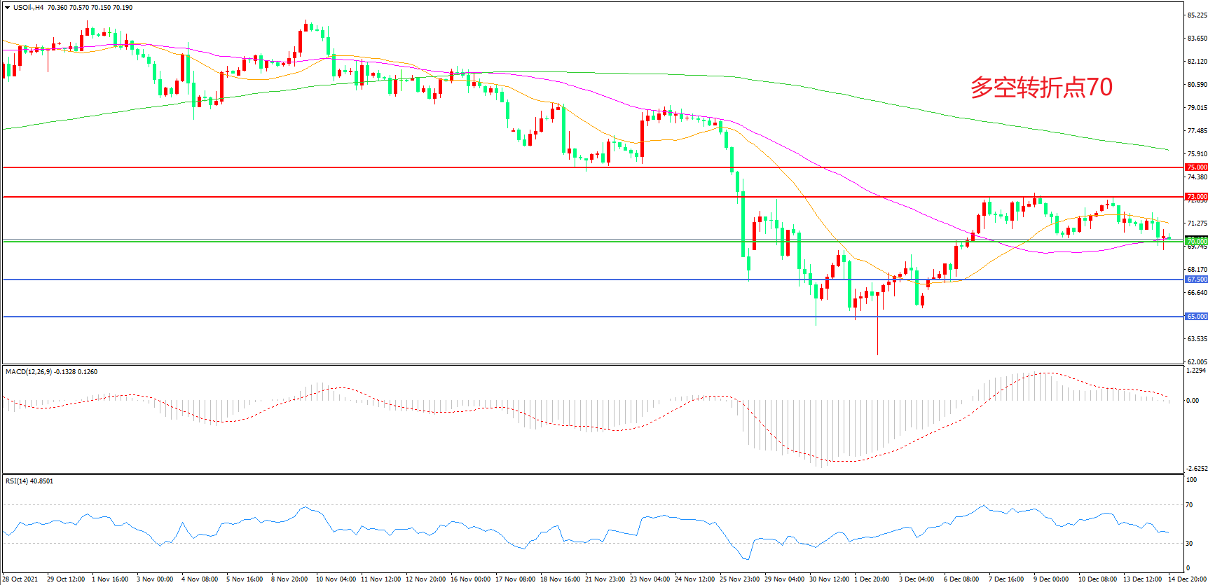 4小时图看,油价延续高位调整,区间震荡继续明显,70美元成为多空分水岭, MACD红柱缩短,RSI指标走平,日内延续震荡概率较大。