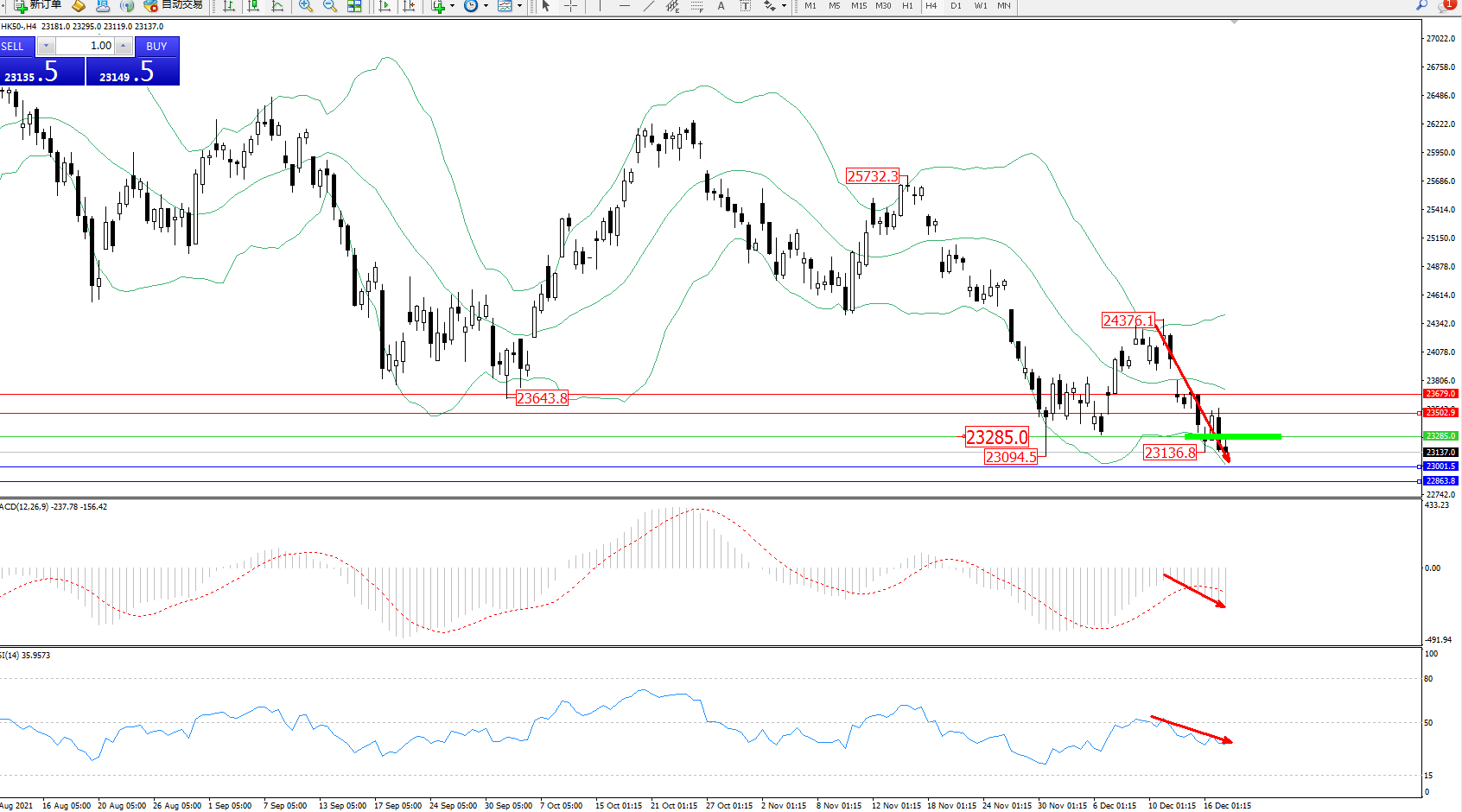 香港恒生指数12月17日(周五)收盘下跌282.87点,跌幅1.2%,报23192.63点;港股再度下挫,三大指数全天呈单边下跌行情,市场情绪十分低迷。恒生科技指数跌2.43%盘中再刷历史新低。权重科技股普跌,美团大跌超5%,快手跌超4%,阿里巴巴、腾讯、京东跌超3%,互联网医疗股集体走低,香港银行股、燃气等个别板块上涨。大市成交额为1626亿港元,南下资金逆势净流入55.29亿港元。