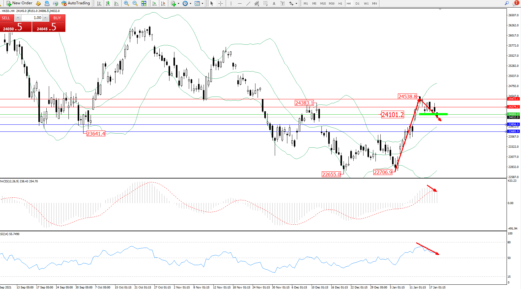 技术点评:多头动力延续布林带指标上轨持续震荡上扬至24538位置附近遇阻回撤,高位空头动力伺机入场震荡下行,布林带指标呈张口走势后开始缓慢收口,短期回撤走势或将持续,MACD指标处于多头区域维持整理徘徊下行,RSI指标处于多头区域窄幅整理下行中;