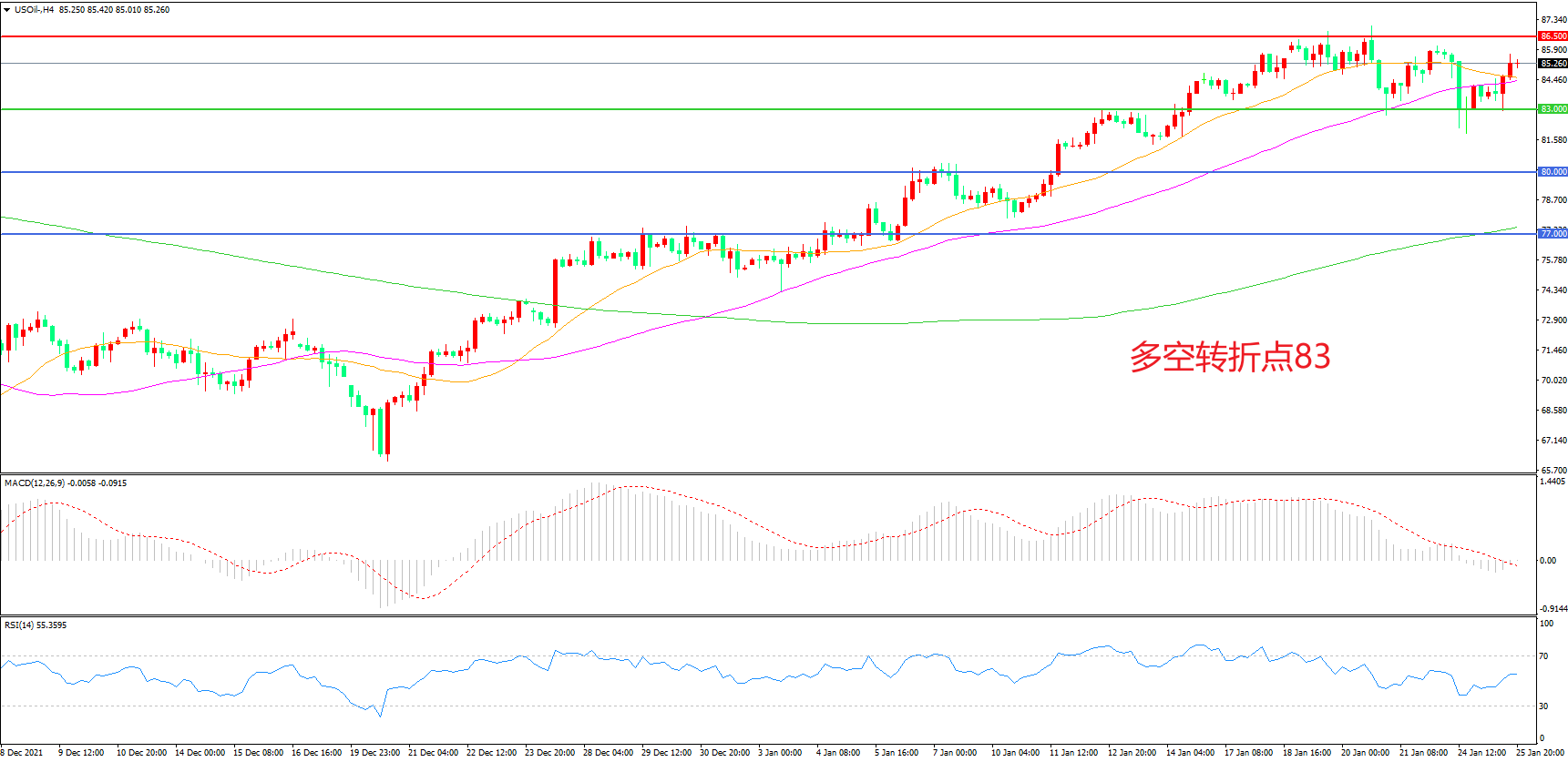周二(1月25日),俄乌局势加剧供应中断担忧,投资者对原油的购买意愿依然强劲,美国WTI原油延续强势表现,收报85.14美元/桶。今天晚上市场将迎来两大数据的冲击,首先是EIA数据的公布,其次是美联储会议的公布,这两个消息都有可能会对油价造成巨大的影响,短线操作谨慎追多。