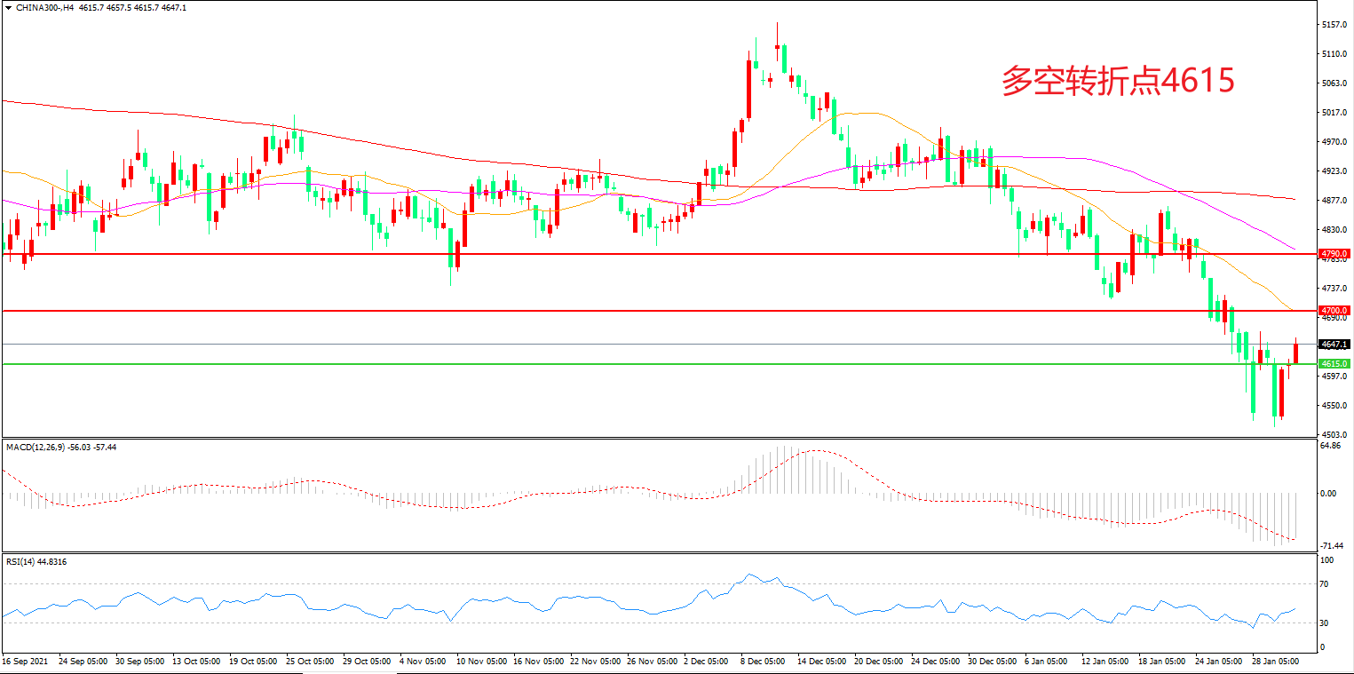 4小时图看,沪深300小幅走高,下行趋势暂缓,但均线系统仍呈空头排列, MACD绿柱缩短,RSI指标走平,日内延续震荡概率较大。