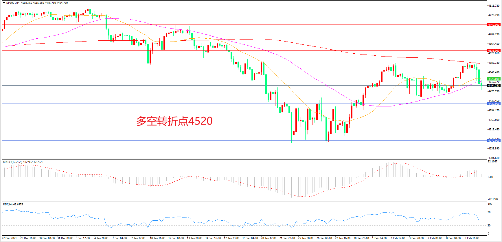 4小时图看,标普500触碰200周期均线后破位下行,短线走势十分低迷,4520一线被跌破,MACD红柱缩短,RSI指标走平,日内震荡下行概率较大。