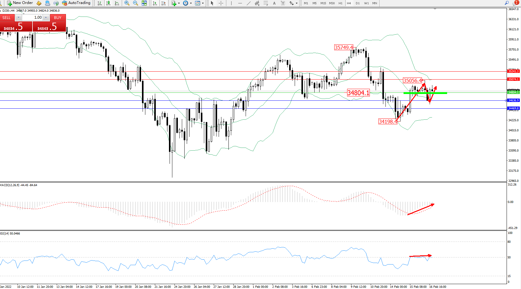 道琼斯指数2月16日(周三)收盘下跌54.57点,跌幅0.16%,报34934.27点;美股收盘,道指低收,地缘政治紧张局势升温和美国升息预期打压金融市场人气,美国1月零售销售大幅反弹,但物价上涨可能削弱本季度消费对经济成长的影响,美联储官员1月会议上认为,美国通胀率过高,经济接近充分就业,有理由尽快进行一次加息。市场认为3月加息是板上钉钉, 有人预测可能会加息至多50个基点。投资者目前预计2022年将至少升息150个基点,远高于几周前预期的75个基点。
