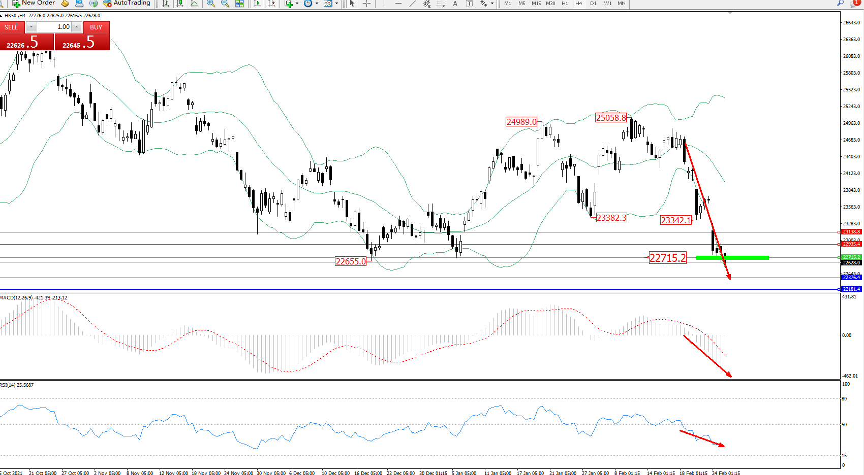 技术点评:市场空头情绪笼罩,延续布林带指标下轨附近不断下探,短期跌势未见有止步迹象,布林带指标呈张口走势持续中,前期低位22655位置已然破位,MACD指标处于空头区域不断下行中,RSI指标处于空头区域持续震荡下挫;