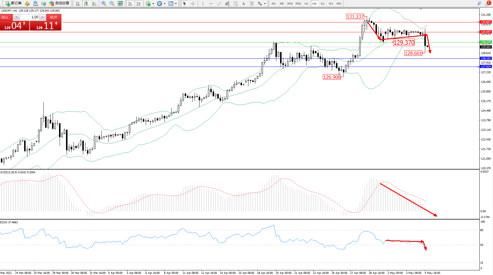 交易策略:129.370下方看跌,目标128.202、127.624