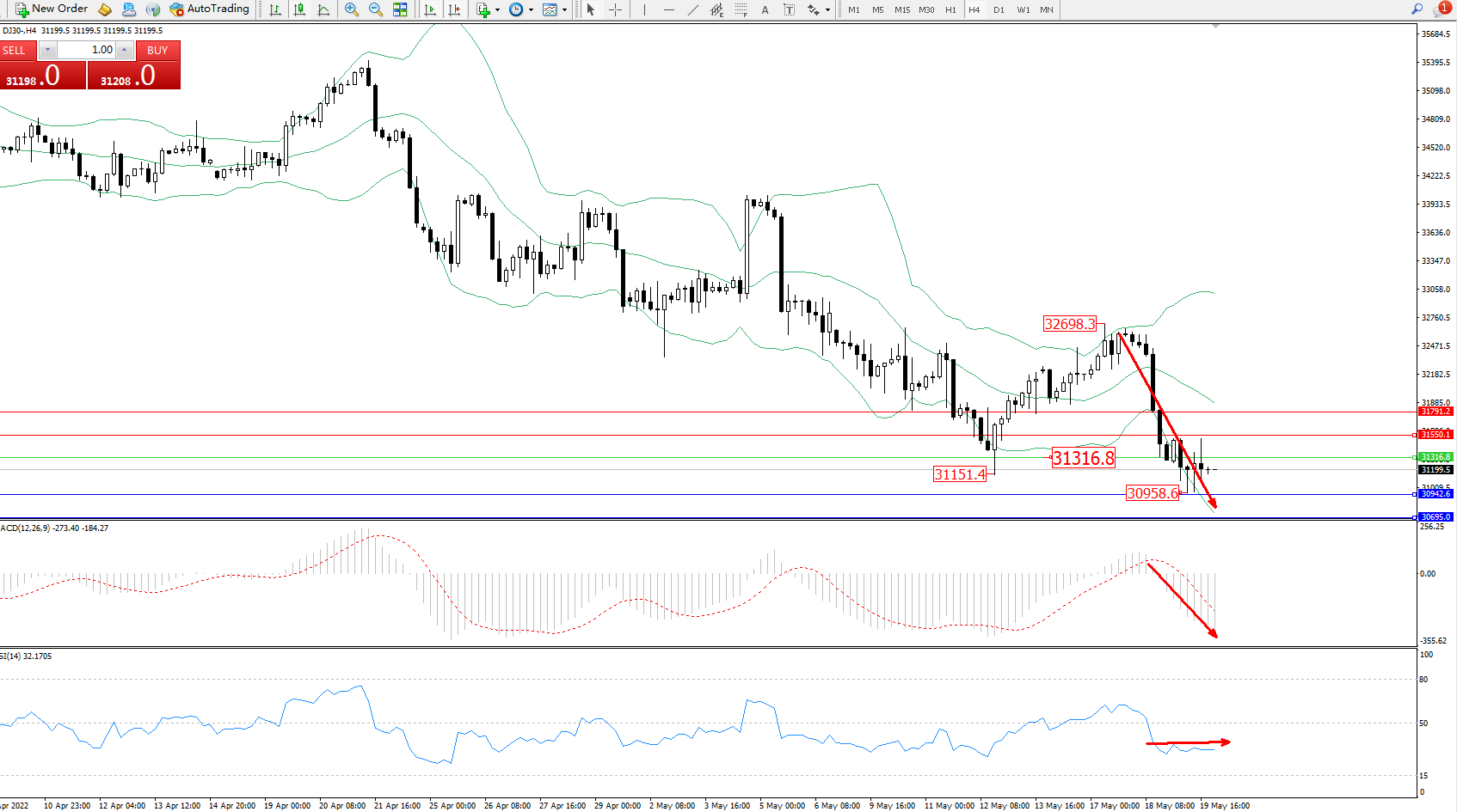 道琼斯指数5月19日(周四)收盘下跌236.81点,跌幅0.75%,报31253.26点;美股收盘,三大股指宽位震荡,道指弱势收跌,全球经济健康状况的担忧情绪日渐升温,加之股市下跌,美国国债收益率全面走低。在美国消费者巨头发出信号后,有关盈利强劲可以帮助投资者度过今年动荡的押注遭到放弃,显示通胀对利润率和消费者支出的影响越来越大。
