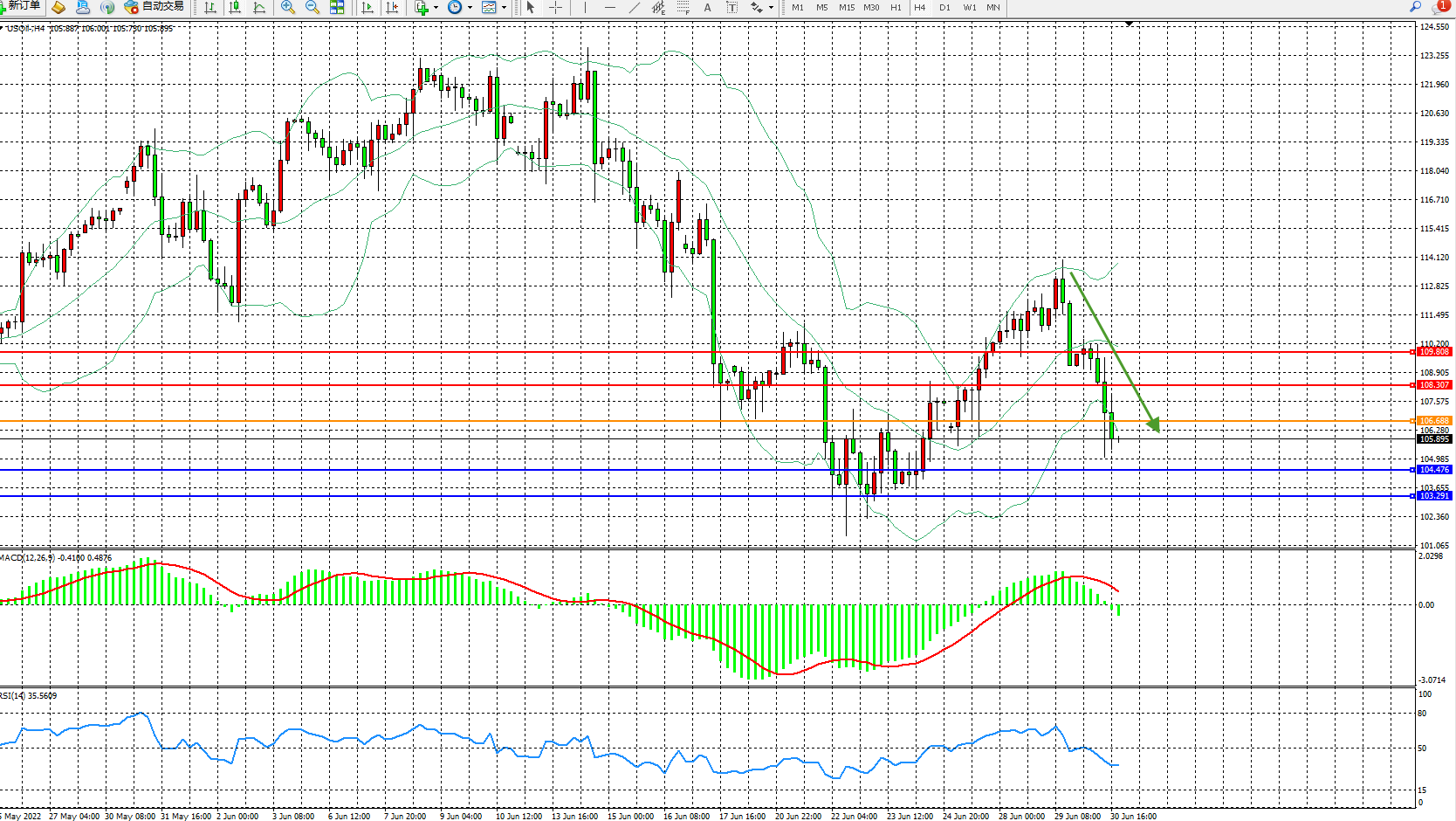 4小时图看:高位空头动力急速下挫,延续布林带指标下轨附近持续震荡下行,布林带指标呈张口走势持续中,MACD指标空头动力维持震荡下行至0轴线下侧徘徊,RSI指标处于50均衡线下侧震荡不断下移;
