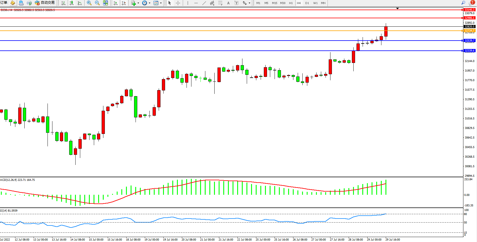 道琼斯指数7月29日(周五)收盘上涨316.82点,涨幅0.97%,报32846.45点;美国7月密歇根大学消费者信心指数终值:本月预期指数从6月的47.5降至47.3,为1980年以来最低。