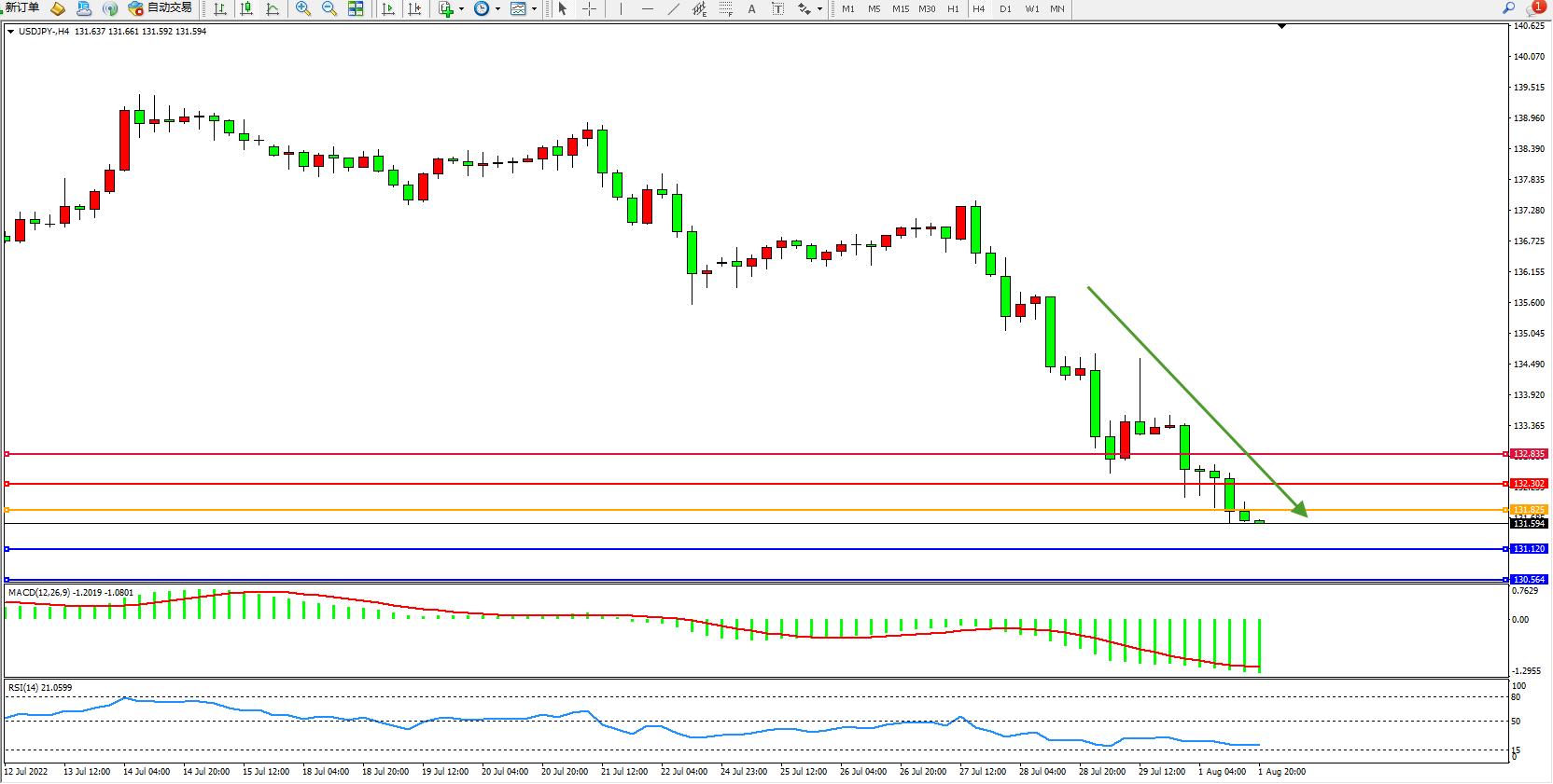 4小时图看:空头动力下行态势良好,短期跌势未见有止步迹象,市场整体偏弱势,MACD指标处于空头区域维持整理平移,RSI指标处于空头区域低位弱势徘徊;
