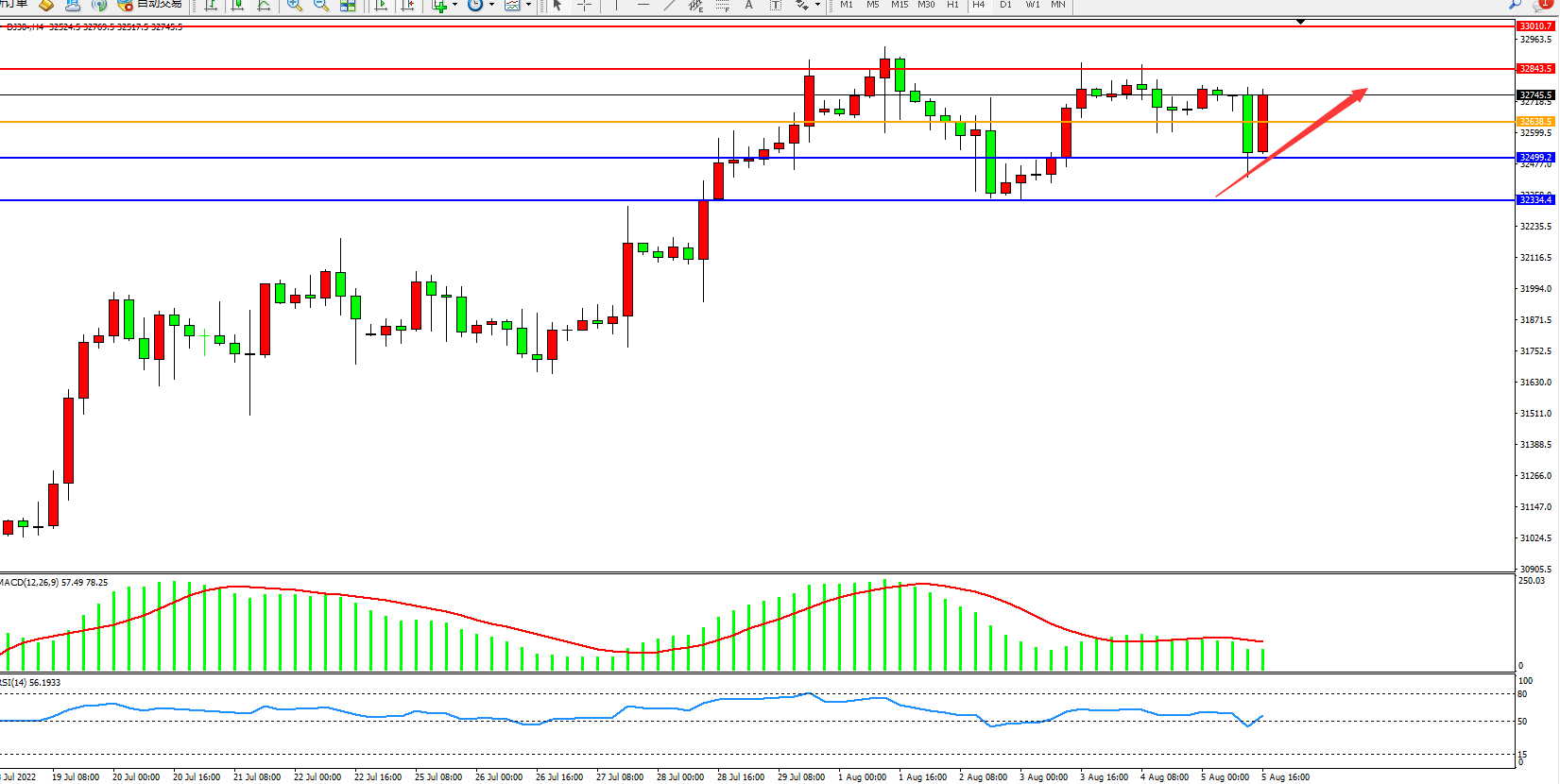 交易策略:32638上方看涨,目标32843、33010