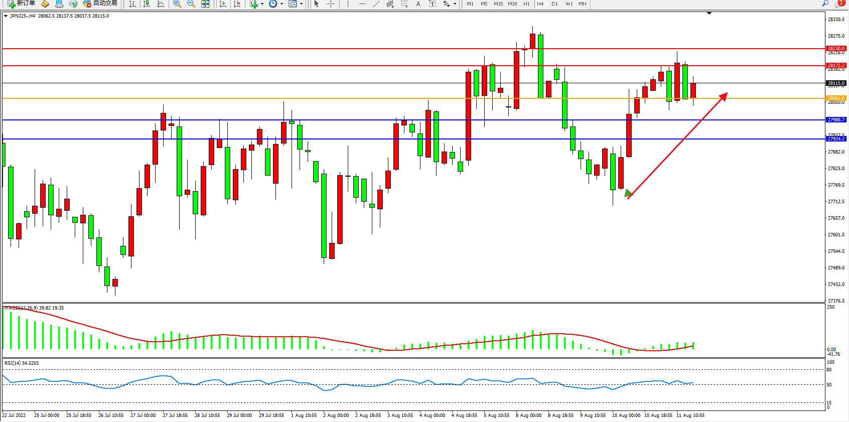 4小时图看:多头动力强势拉升上扬,高位窄幅整理,MACD指标处于0轴线上側窄幅整理,RSI指标处于50均衡线上側弱势徘徊;