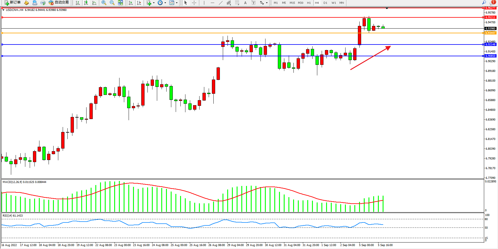 交易策略:6.93447上方看涨,目标6.95211、6.96277