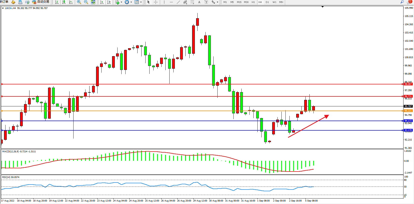 布油维持95.707附近震荡,投资者对欧元区和英国的经济衰退担忧挥之不去,略微限制油价涨幅,但整体来看,油价上周守住关键支撑后,后市震荡重拾涨势的可能性有所增加。